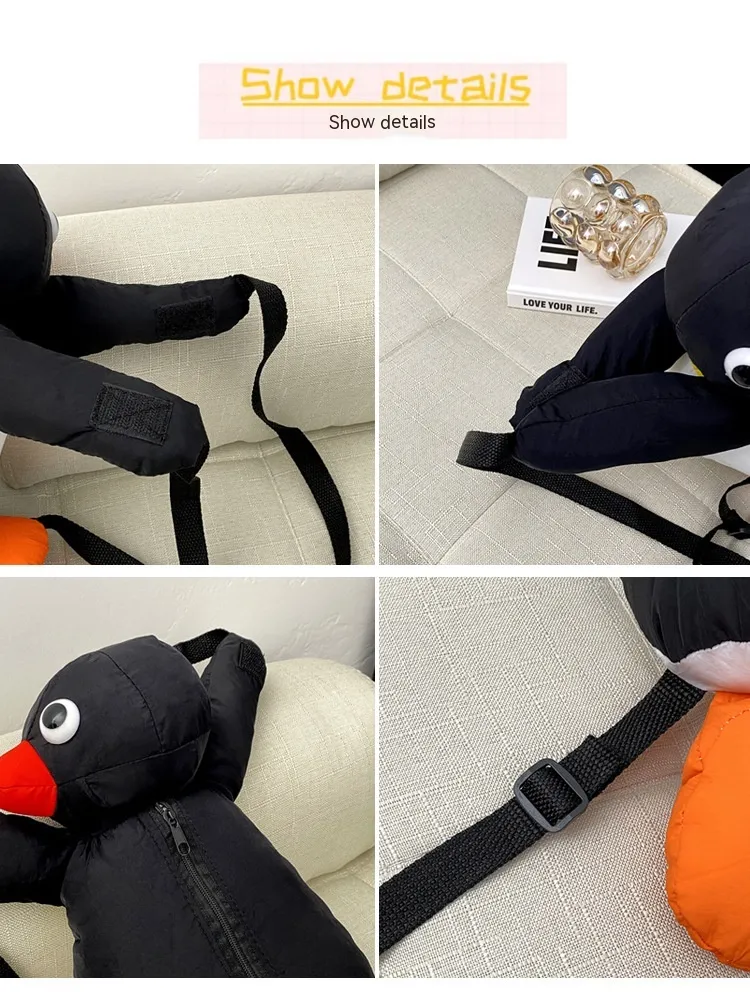 The standout feature of this backpack is its plush penguin design, complete with detailed facial features and a soft, huggable body. It’s