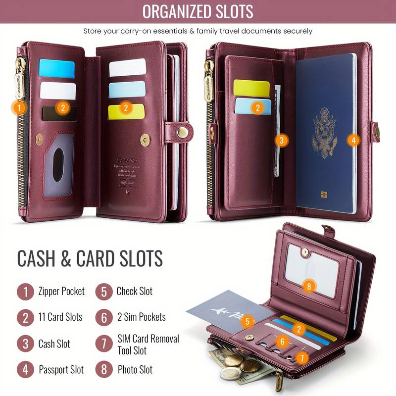 The CaseMe Passport Holder is designed for travelers who value security, organization, and style. Crafted from high-quality faux leather, this sleek and durable travel accessory features a zipper closure, keeping your important documents and valuables safe and secure. With 11 card slots, multiple cash compartments, and a coin purse, this passport holder provides ample space to organize your travel essentials. Additionally, the RFID-blocking technology ensures that your credit card and passport information are protected from unauthorized scanning.