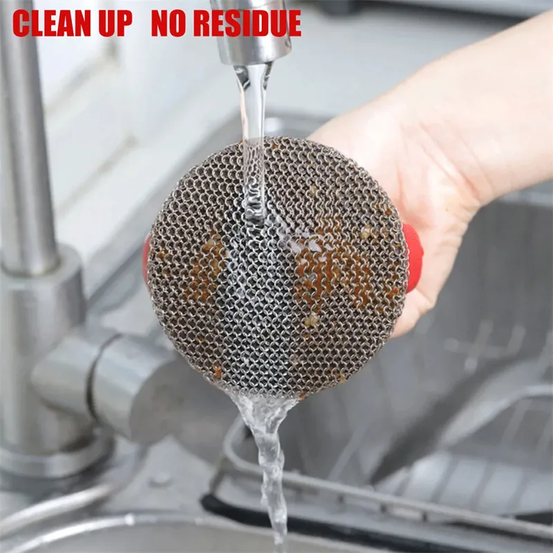 Cast Iron Scrubber 316 Stainless Steel Cast Iron Scrubber With Handle Steel Wool Scrubber Round Chainmail Scrubber Brush Kitchen Gadgets