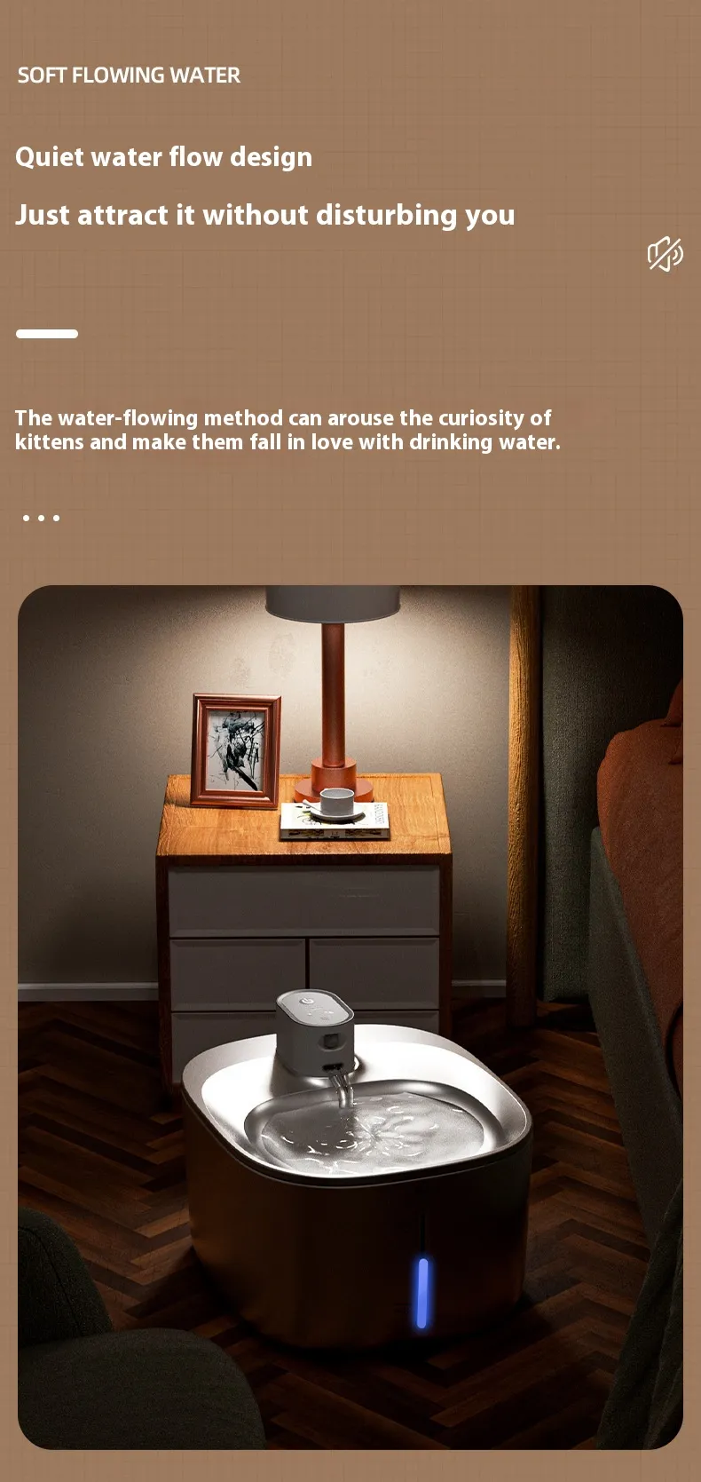 Gentle pump creates flowing water that attracts cats and encourages drinking.