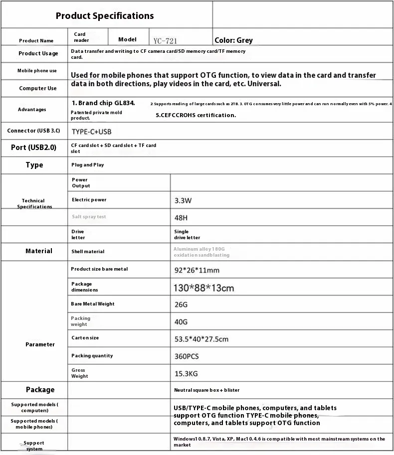 In conclusion, the CF Card Reader SD Card USB Three-in-One is a must-have tool for anyone who needs to transfer data between different types of media. Its ability to support CF, SD, and USB cards in one compact and portable device makes it incredibly versatile and convenient. Whether for personal use, photography, videography, or office work, this card reader ensures fast and efficient file transfers, helping you save time and improve productivity.