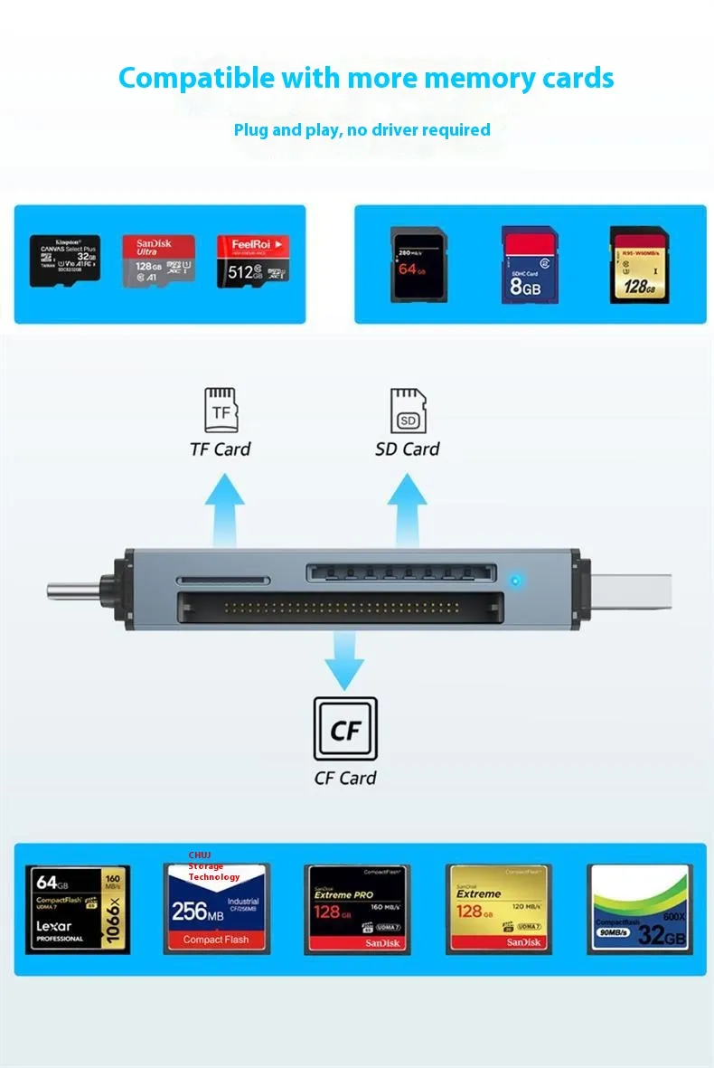 Whether you're editing photos, backing up files, or simply transferring documents, the CF Card Reader SD Card USB Three-in-One ensures fast, reliable performance with plug-and-play functionality, making it an essential tool for both personal and professional use.