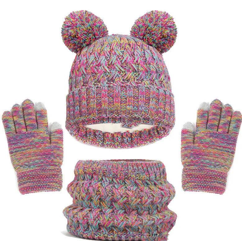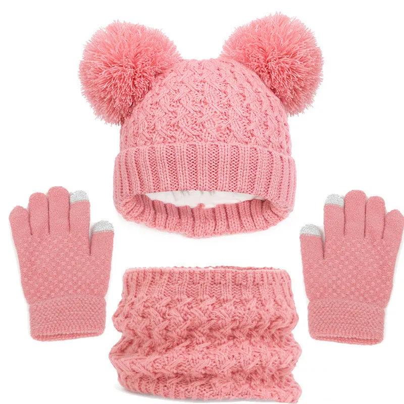 Children's Autumn And Winter Fleece-lined Thickened Double Ball Hat Scarf Gloves Three-piece Set
