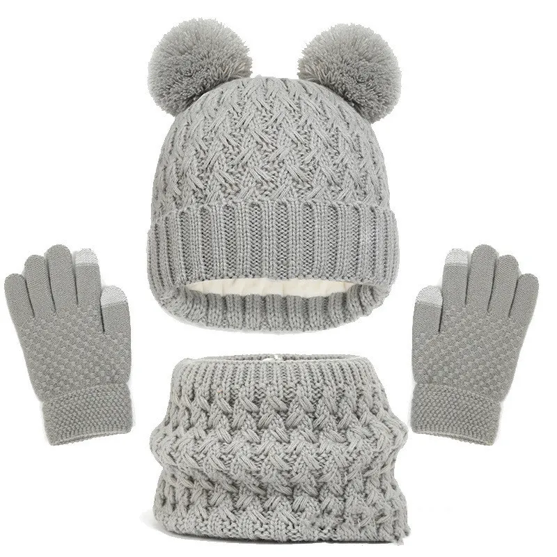 Keep your little ones cozy and stylish with this children's fleece-lined three-piece set, featuring a double ball hat, scarf, and gloves designed for autumn and winter. This adorable set is made from thickened, high-quality materials that provide exceptional warmth and comfort, making it perfect for chilly days. The fleece lining ensures a soft and snug fit, keeping your child warm during outdoor play, school trips, or family outings. The playful double pom-pom design on the hat adds a fun and cute element that kids will love.