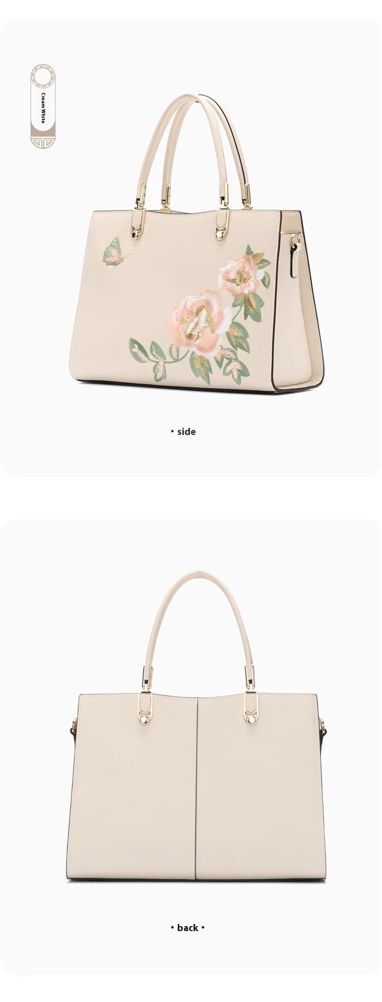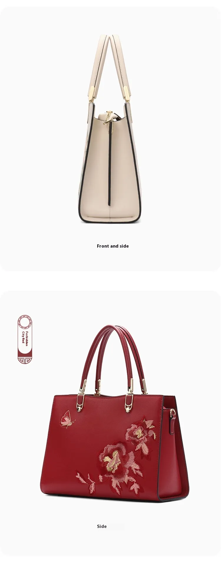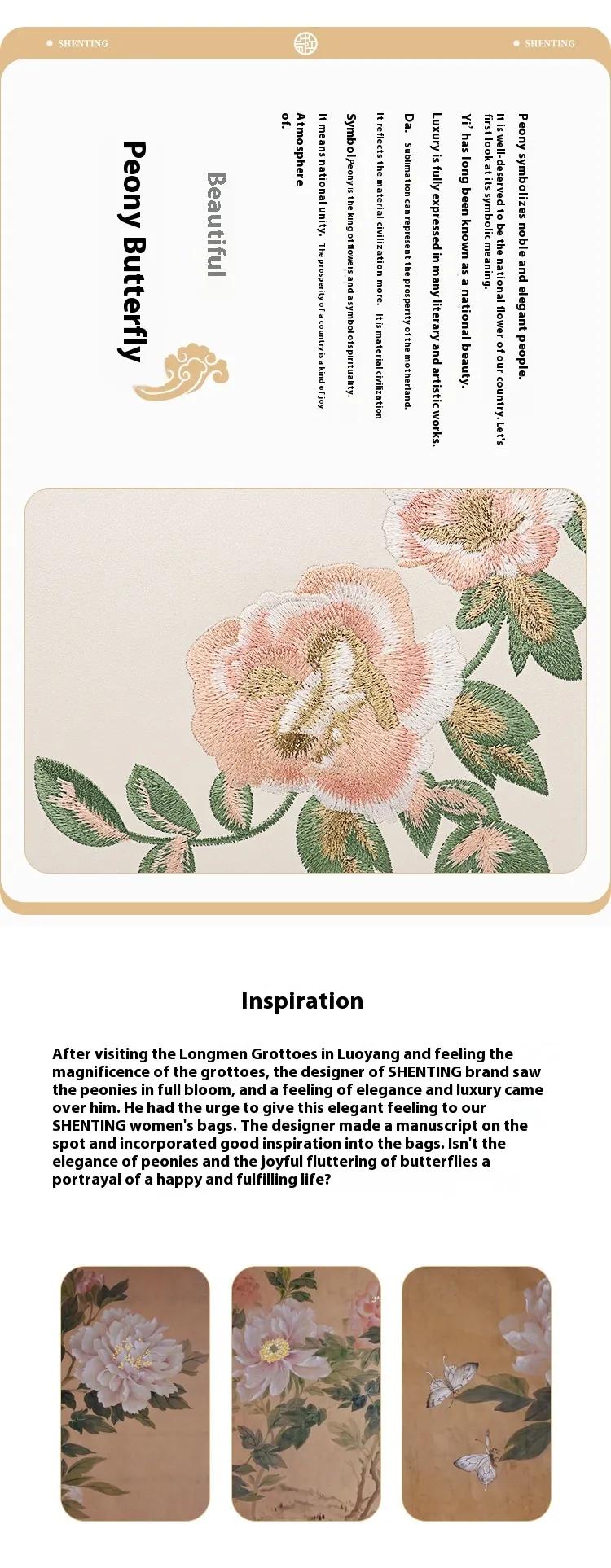 The Chinese peony and butterfly embroidery on this bag is a symbol of beauty and elegance. The intricate floral designs combined with butterfly motifs showcase fine craftsmanship, adding a layer of sophistication and artistry to the bag. The embroidery texture is not just visually stunning, but also adds a unique, luxurious touch to the overall design.
