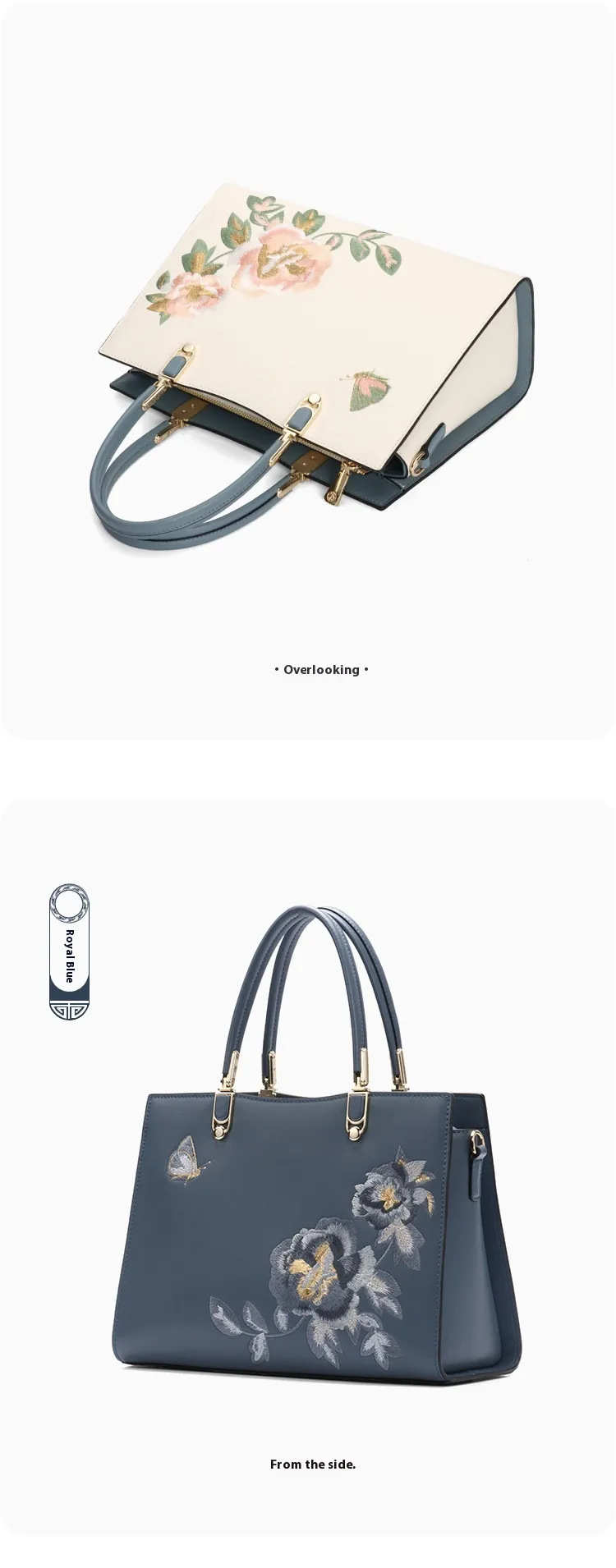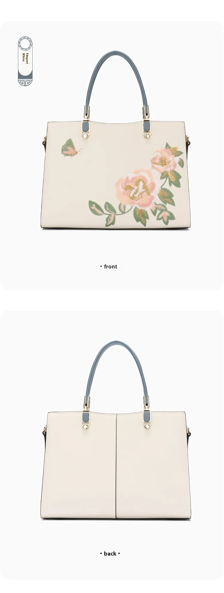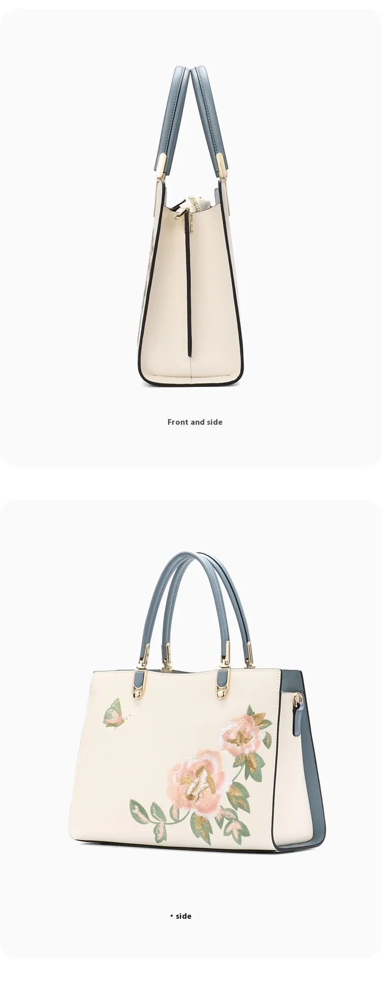 The Chinese peony and butterfly embroidery on this bag is a symbol of beauty and elegance. The intricate floral designs combined with butterfly motifs showcase fine craftsmanship, adding a layer of sophistication and artistry to the bag. The embroidery texture is not just visually stunning, but also adds a unique, luxurious touch to the overall design.