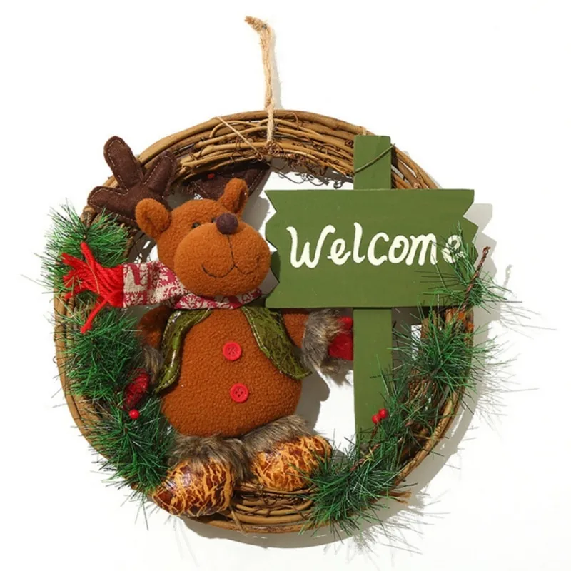 This cute crown features a plush doll on a sturdy natural rattan base with the "Merry Christmas" / " Let It Snow" / "Welcome" logo.