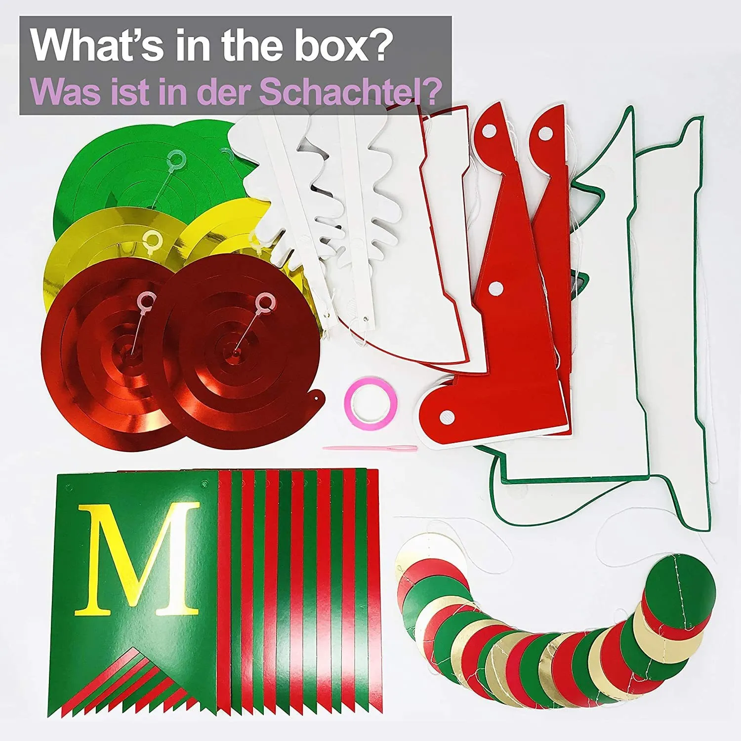 Includes honeycomb balls, Santa hats, hanging pendants, letter flags, spiral streamers, and festive latte-art tools.