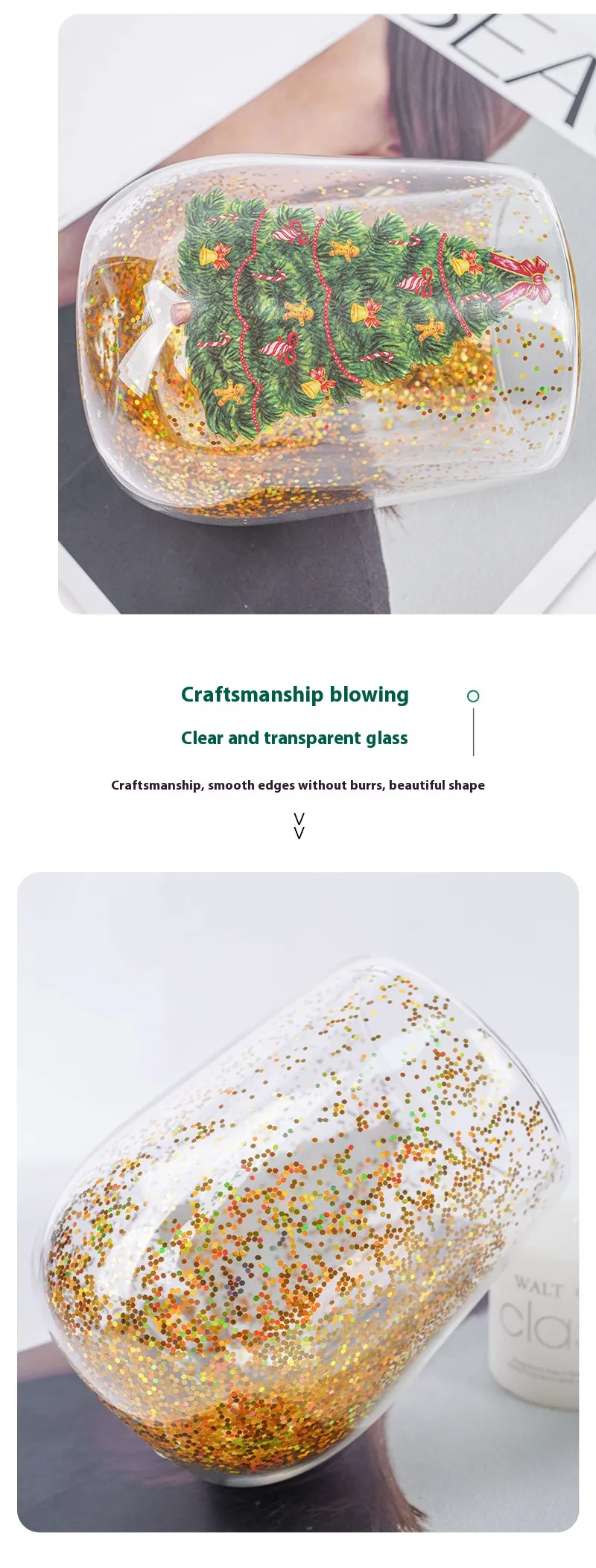 Whimsical Christmas Tree Design: Shaped like a charming Christmas tree, our tumbler embodies the true essence of the holiday season. The whimsical design adds a joyful touch to any gathering, be it sipping on hot cocoa or chilled eggnog. Watch as the glitter flows and sparkles between the double layers, creating a mesmerizing snow globe effect in your cup