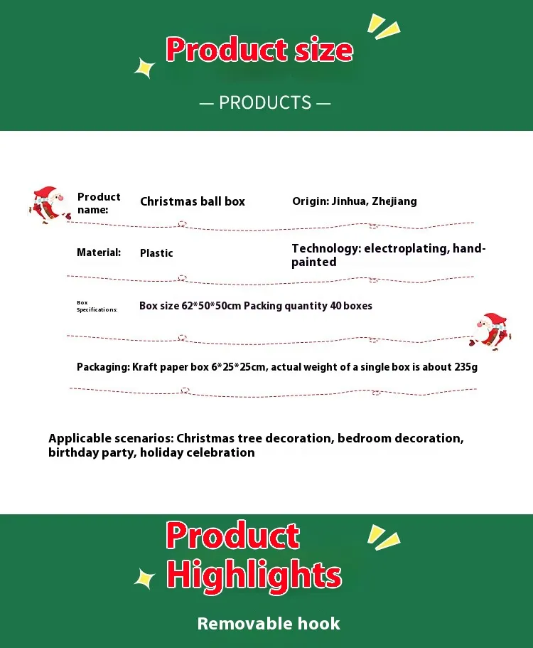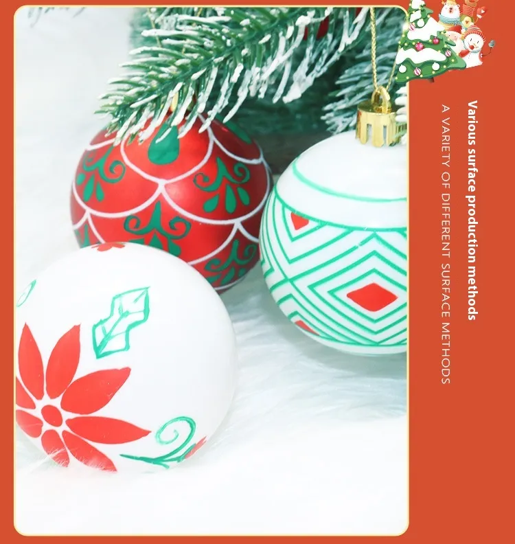 The Christmas Ball Plastic Electroplating Suit Decorations are crafted to transform ordinary spaces into festive showcases of style and warmth. Each ball is made from durable, eco-friendly plastic and finished using advanced electroplating methods. This process creates a glossy, reflective surface that rivals the beauty of glass while remaining lightweight and shatterproof.