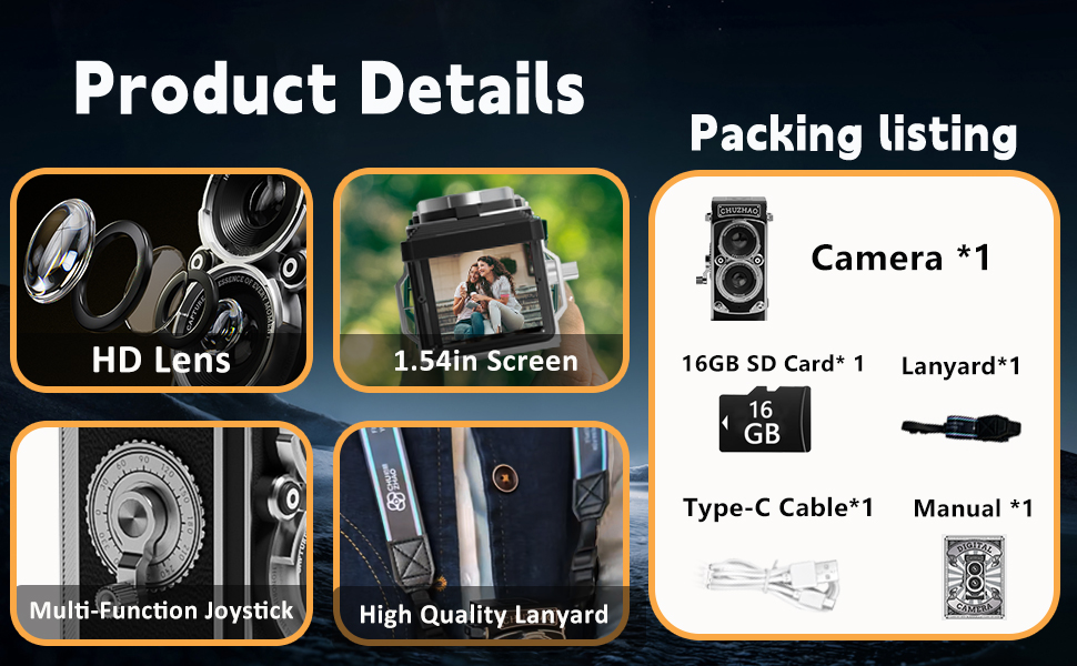 - GREAT GIFT IDEA: Packed in an elegant gift box, the CHUZHAO retro snap camera makes an ideal gift for birthdays, holidays, or special occasions. Instantly ready for use, our mini retro camera iIncludes a 16GB SD card, stylish lanyard, and Type-C cable