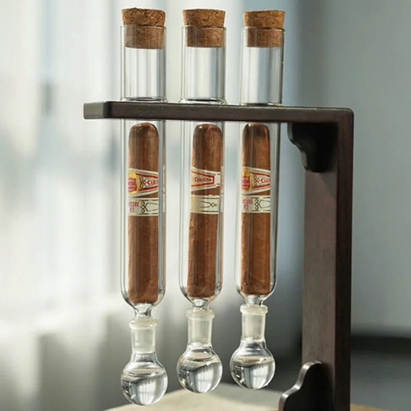[Adding Flavor to Cigars]:The dual-chamber humidity control design helps maintain optimal 68-72% humidity levels for aging cigars, while allowing subtle flavor infusion if desired. Just fill the Whisky, Brandy, Vodka, Coffee Beans or other favorite aromatherapy liquid into the glass ball and connect glass tube, waiting 5–7 days or longer for cigar flavor infuser[Cigar Flavor Infuser Kit]: Including 3 premium borosilicate glass cigar tubes (height 10″, open diameter 1.1″), 3 aromatherapy ball base (height 2.2″, open diameter 0.59″), 6 fitted wooden plugs, 1 handmade pine display stand(8.6″L× 3.3″W × 10.3″H), 1 little pine base(2.5″L× 2.5″W × 1.2″H)