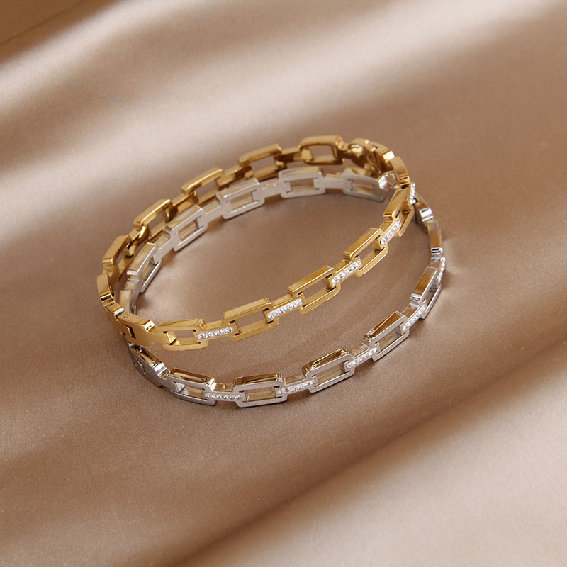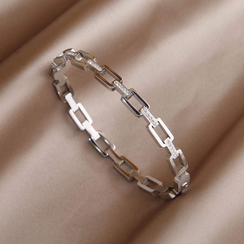 Maintain your Classic Stainless Steel Hollow Geometric Charm Bracelet by gently wiping it with a soft cloth after wear. Avoid exposure to harsh chemicals, perfumes, and moisture to keep the crystals sparkling and the metal shining. Store in a jewelry pouch or box to prevent scratches.