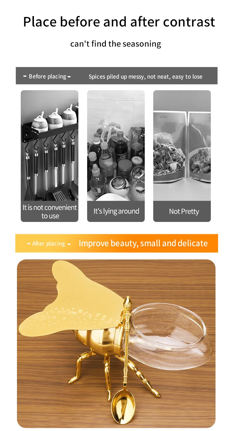 Crafted from durable materials, the metal bee sugar bowl and seasoning jar set are not only visually striking but also built to last. The included spoon makes serving your favorite sweeteners or spices easy, while the airtight lid ensures your contents stay fresh for longer. Whether you're preparing for a dinner party or simply want to add a decorative touch to your kitchen counter, this set offers both beauty and convenience.