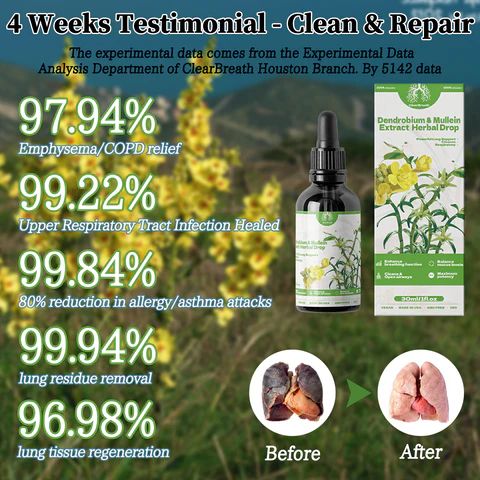 Breathe-Right Herbal Drops are absorbed sublingually. The ingredients act on the lungs and respiratory system through the blood, stimulate and thin the mucus in the trachea and lungs, help expel phlegm and lung residues within 2 hours, dredging the airway. It can also help correct your immune system, reduce allergic reactions through desensitization therapy, and effectively treat diseases such as respiratory allergies/asthma. The fifth-generation human modified protein repair factor created by our research team, combined with the extracts of mullein and Dendrobium officinale, helps the regeneration of lung trachea and alveolar tissue, giving you a healthy and unobstructed lung.