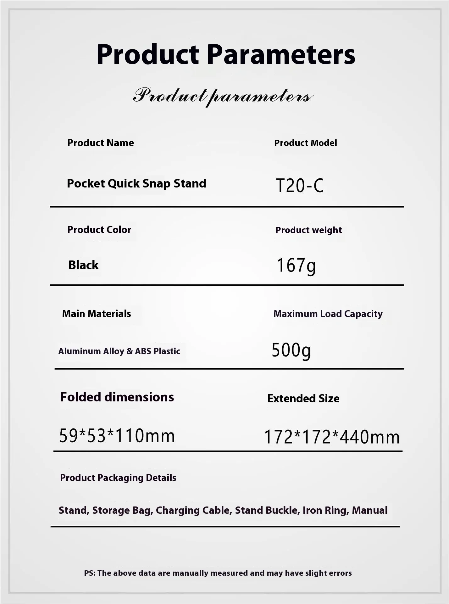 Stand, storage bag, charging cable, stand buckle, iron ring, instruction manual