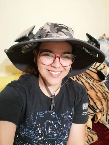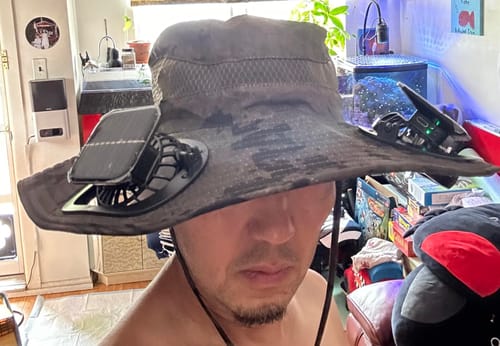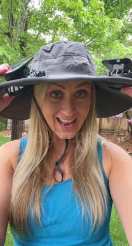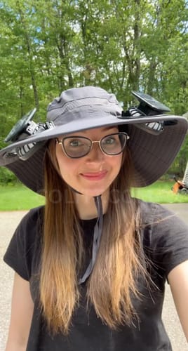 this hot summer days, but I love the wide brim, so it protects my neck and face from sunburn. The fan is awesome. It’s very strong.