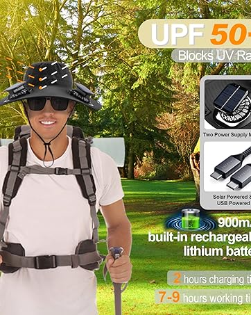 - Sunproof: Solar fan fishing hat is wide brim, 5 inches wide brim provides ample protection for your face and neck of sunshade. Large-area hat shielding combined with UPF50+ fabric, effectively blocked direct sunlight. Your face and head stay cool and comfortable while you're gardening, fishing, or just taking a leisurely stroll, without the need for constant adjustments