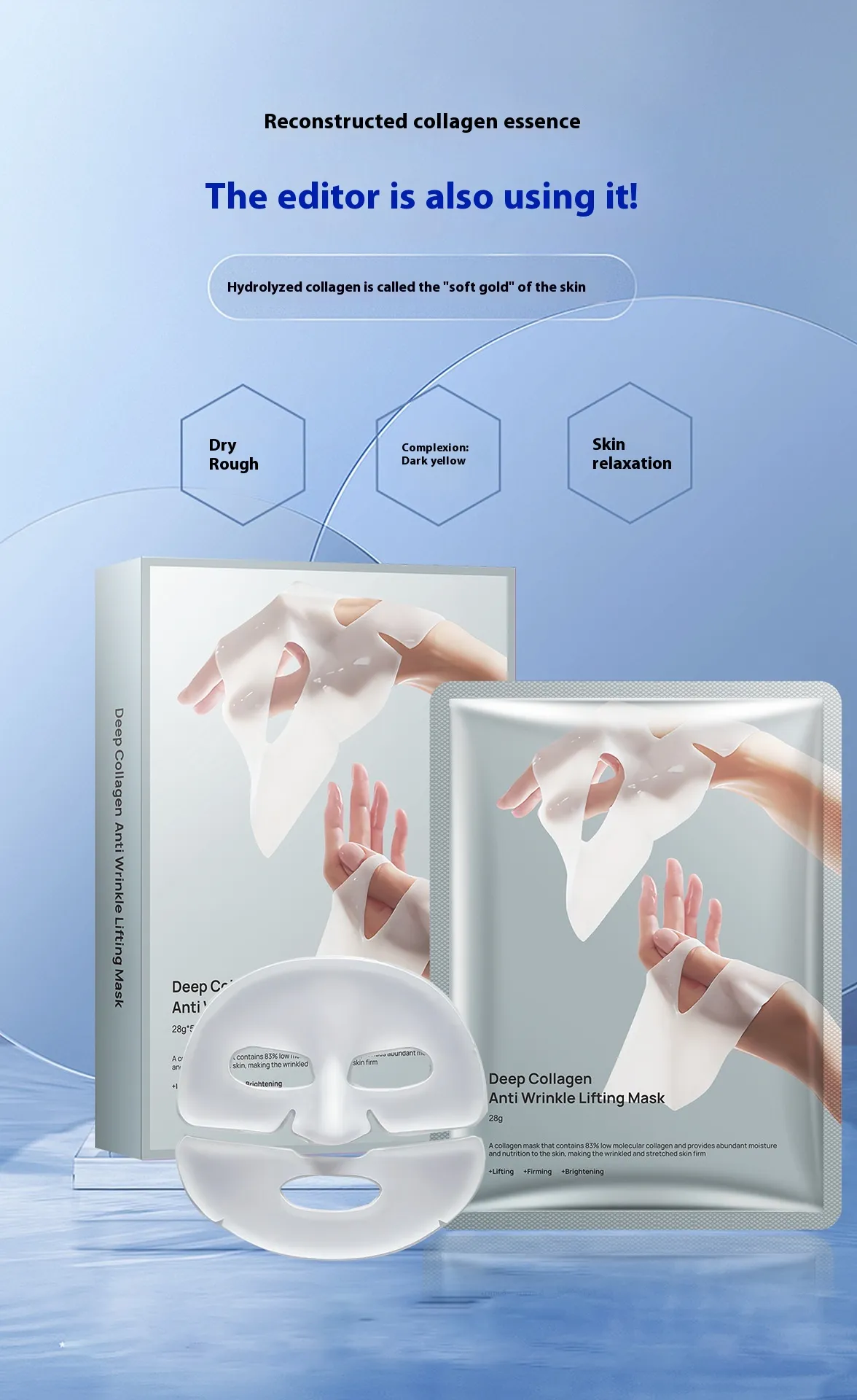 Collagen mask, anti-aging mask, firming mask, hydrating skincare, wrinkle-reducing mask, brightening face mask, nourishing face mask, collagen skincare.