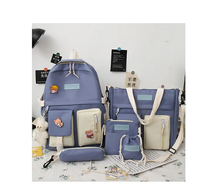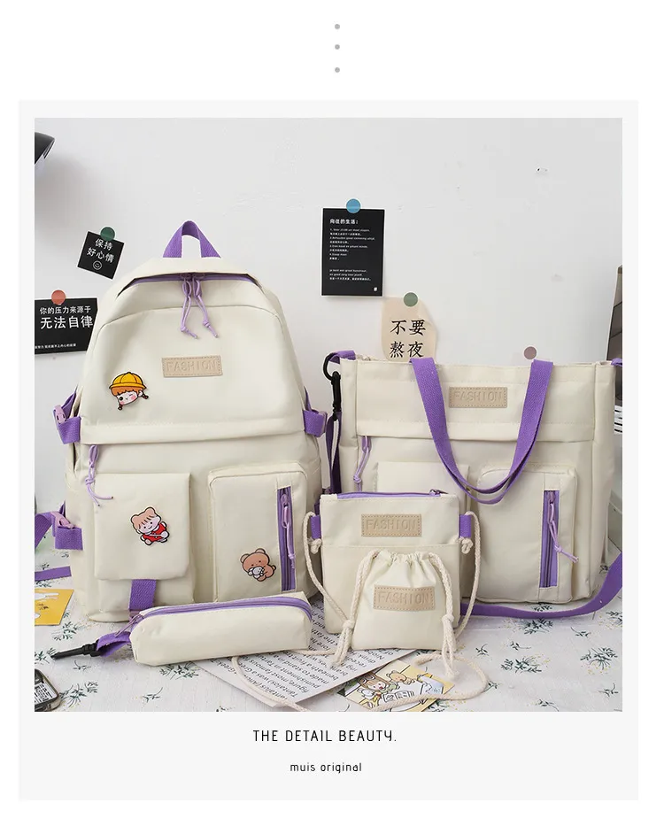 College Students' Backpack Five-piece Contrast Color Canvas School Bag