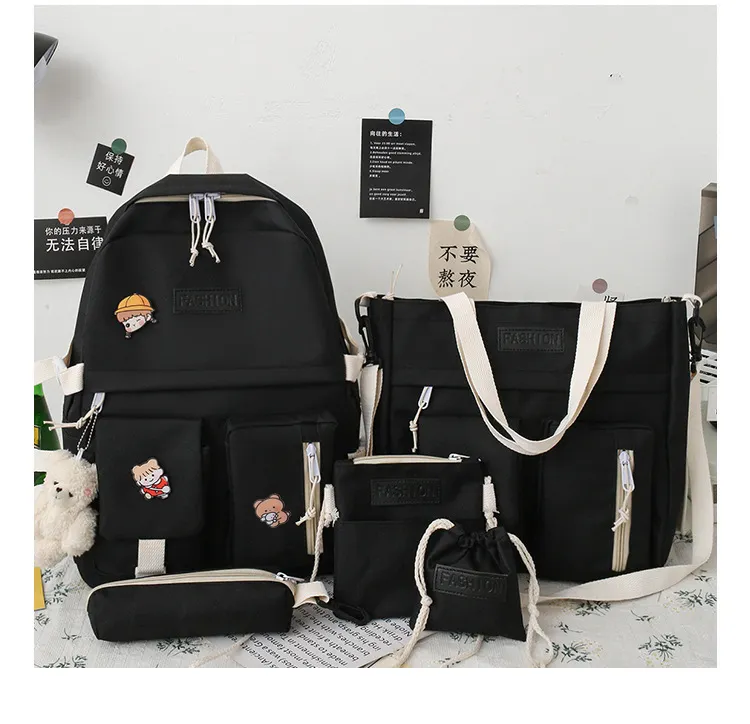 The College Students' Five-Piece Contrast Color Canvas School Bag is a stylish and versatile backpack set designed to meet the needs of busy students. Made from durable canvas material and featuring a trendy contrast color design, this set includes everything a student needs for a well-organized and fashionable day at school or college. With multiple compartments, spacious interiors, and additional matching accessories, this backpack is both practical and chic.