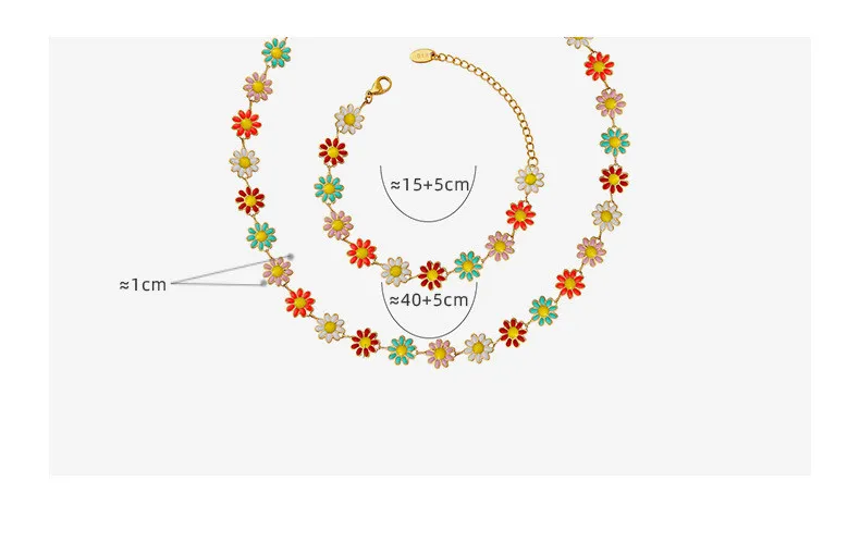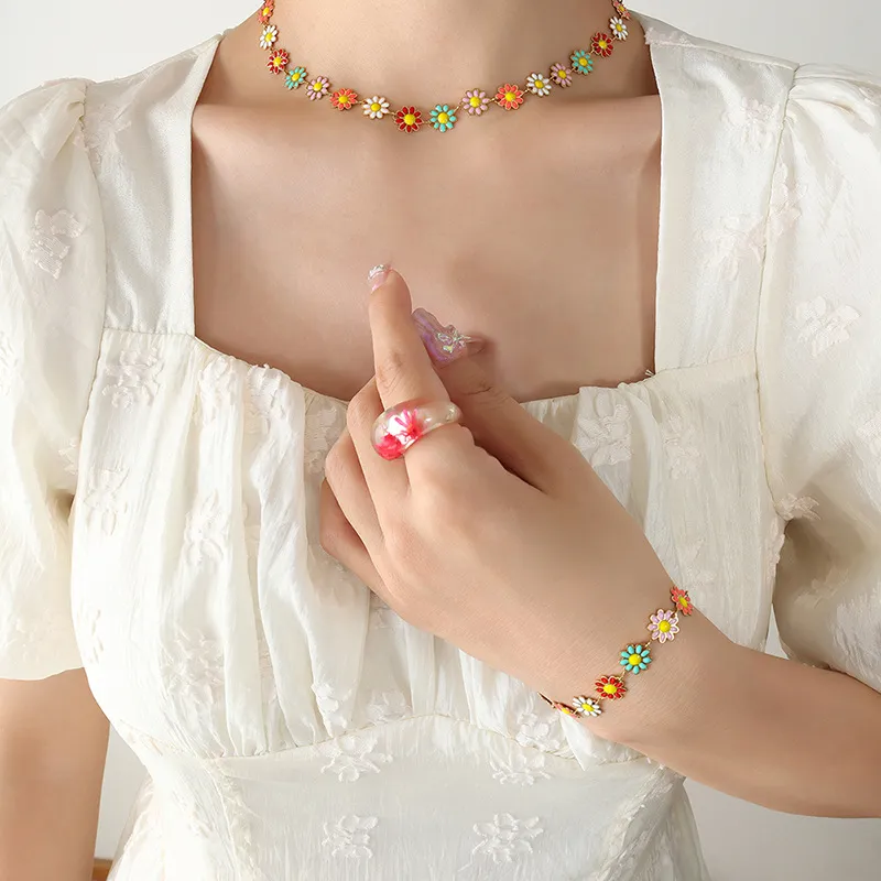 Colorful Small Flower Drop Oil SUNFLOWER Chain Stitching Necklace Bracelet Jewelry Set
