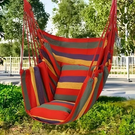 Crafted from high-quality canvas material, this hammock chair features a vibrant striped pattern that adds a splash of color to any setting. The sturdy construction ensures it can withstand regular use, making it suitable for both indoor and outdoor environments. Its lightweight design allows for easy transport, making it an excellent choice for camping trips or picnics. The hammock comes with back support and two seat cushions, providing enhanced comfort during use. It's suitable for all ages and can be used in any indoor or outdoor space. Joom