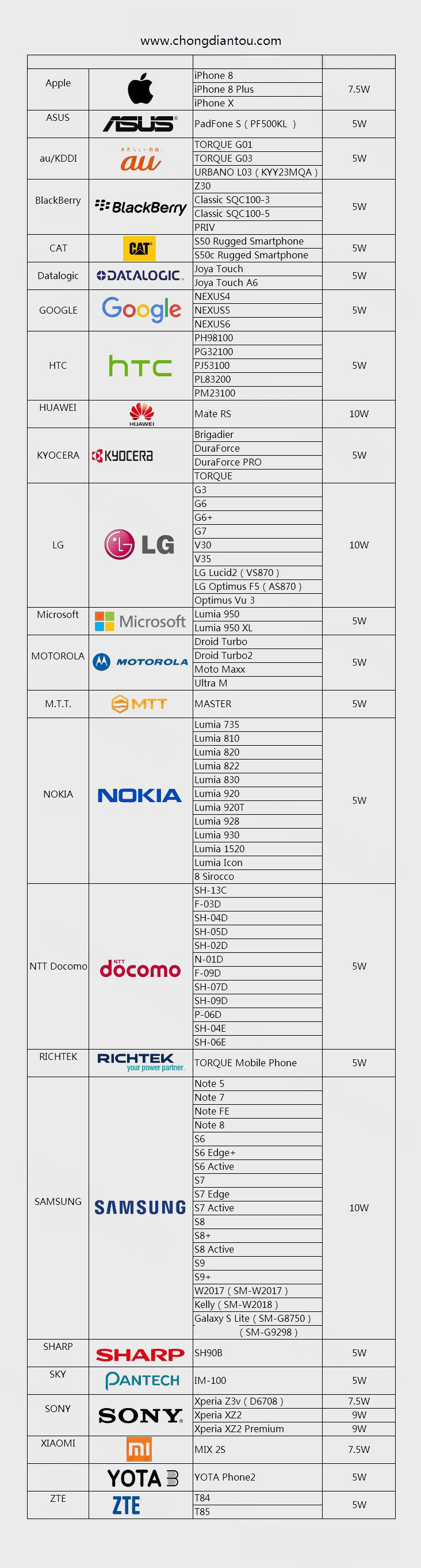 Mobile phone charging power: 5W / 7.5W / 10W