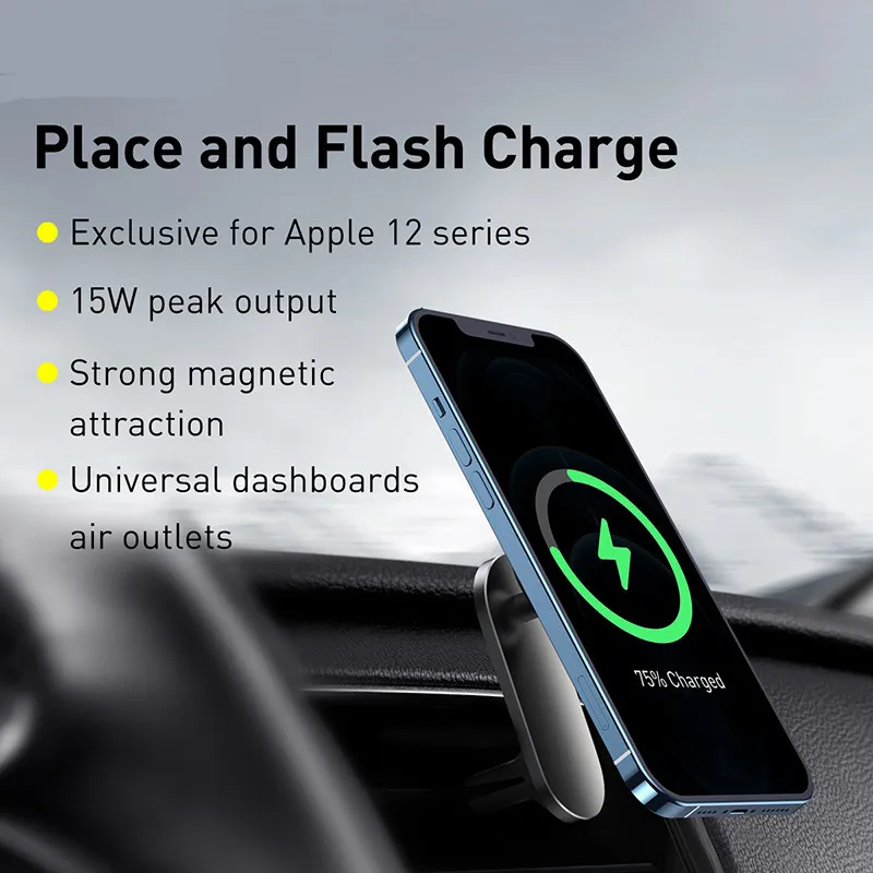 - Magnetic Alignment for Secure Hold: The magnetic car bracket securely holds your Apple device in place, even on bumpy roads. With strong magnetic alignment, your phone will stay firmly attached to the charging base, ensuring it won’t slip or fall while you drive.