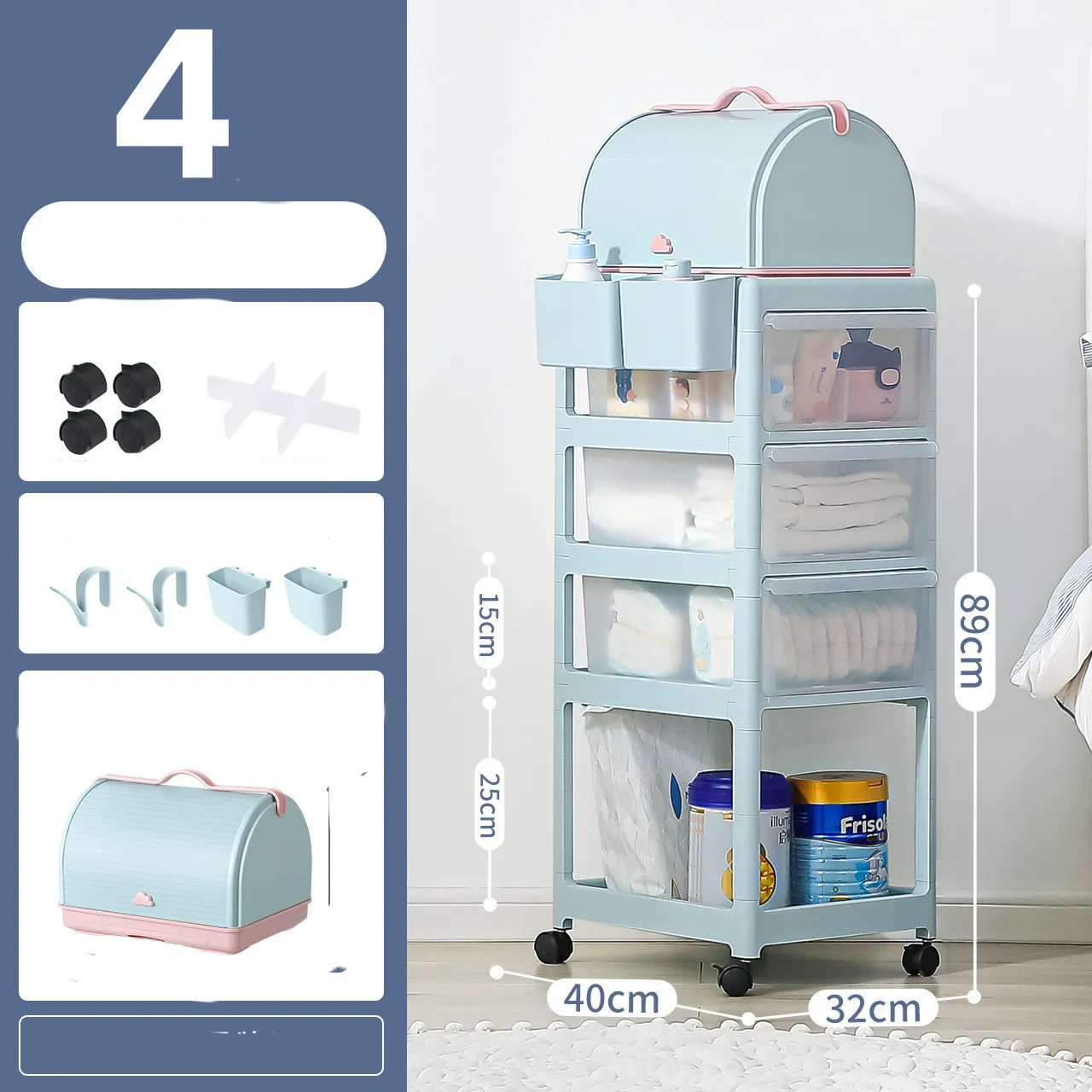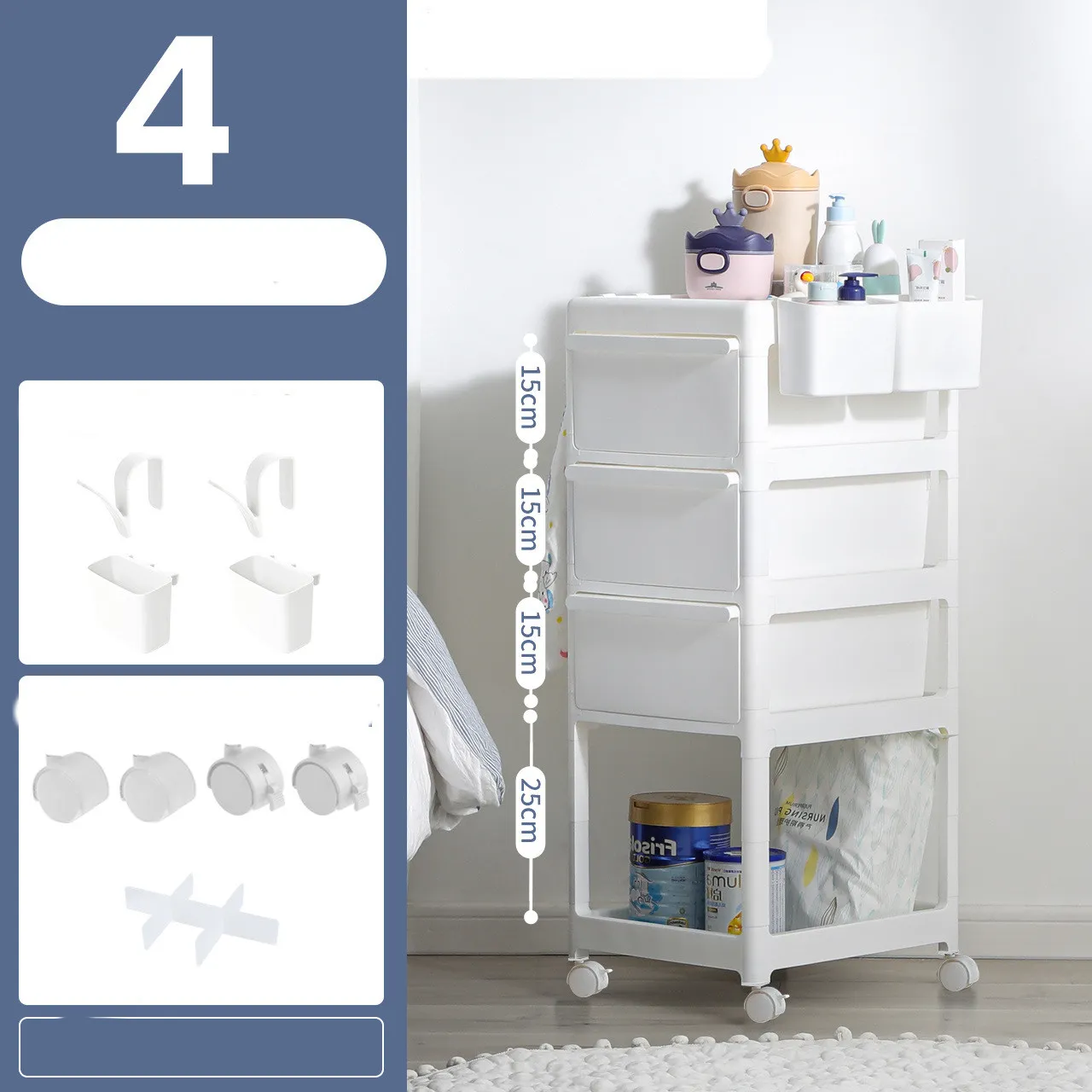 Universal wheel X4, partition x3, hook X2, hanging box X2, storage cabinet * 1