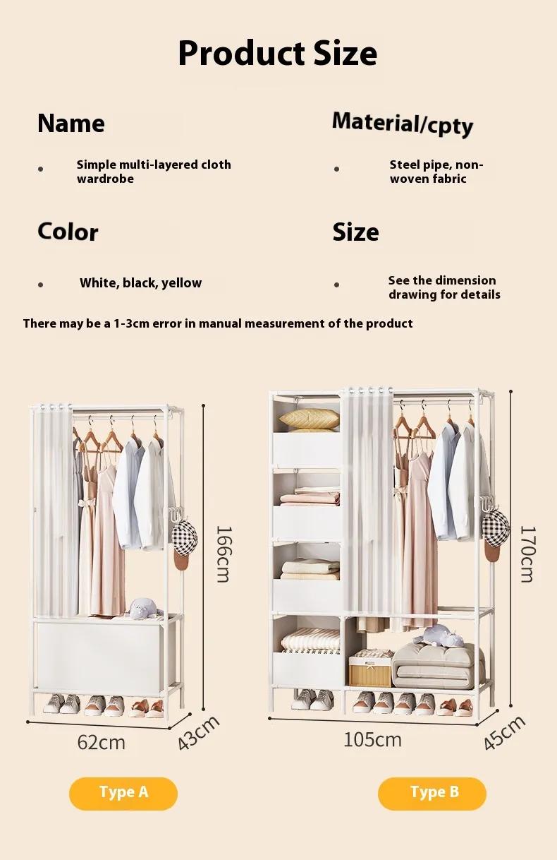 These wardrobes are easy to assemble and require no tools, making them a convenient choice for those who need quick, hassle-free storage solutions. With multiple compartments and hanging rods, the wardrobe provides ample space for clothes, shoes, and accessories, helping you keep your living space organized and tidy.