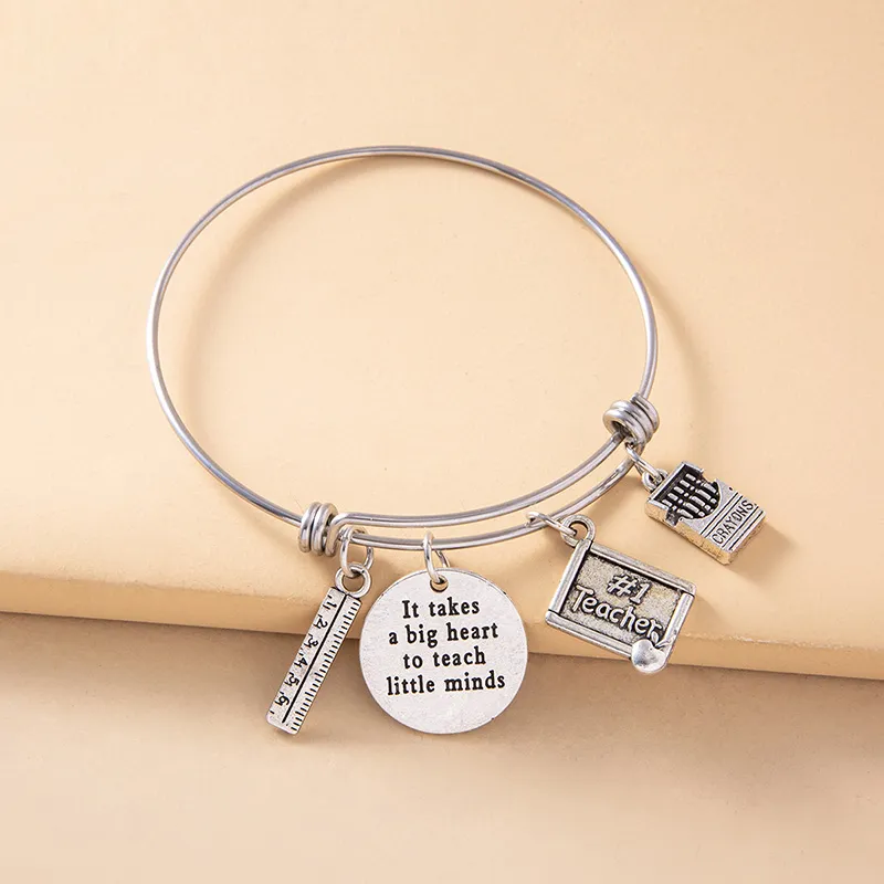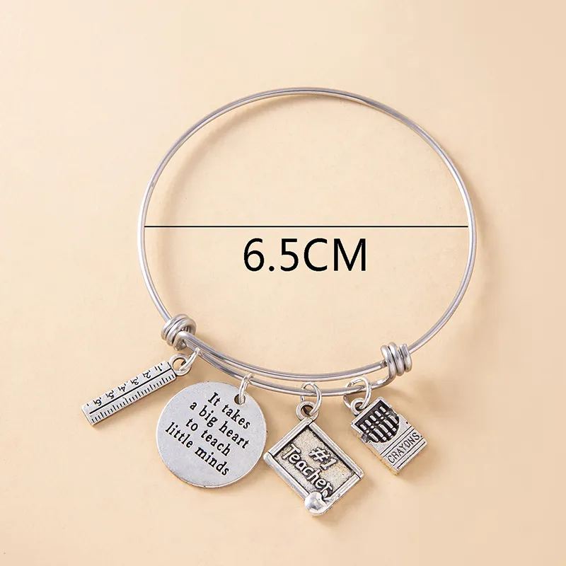 Creative Silver Ruler Crayons Charms Inspirational Bracelet Vintage Stainless Steel Adjustable Bangle Teacher's Day Gift