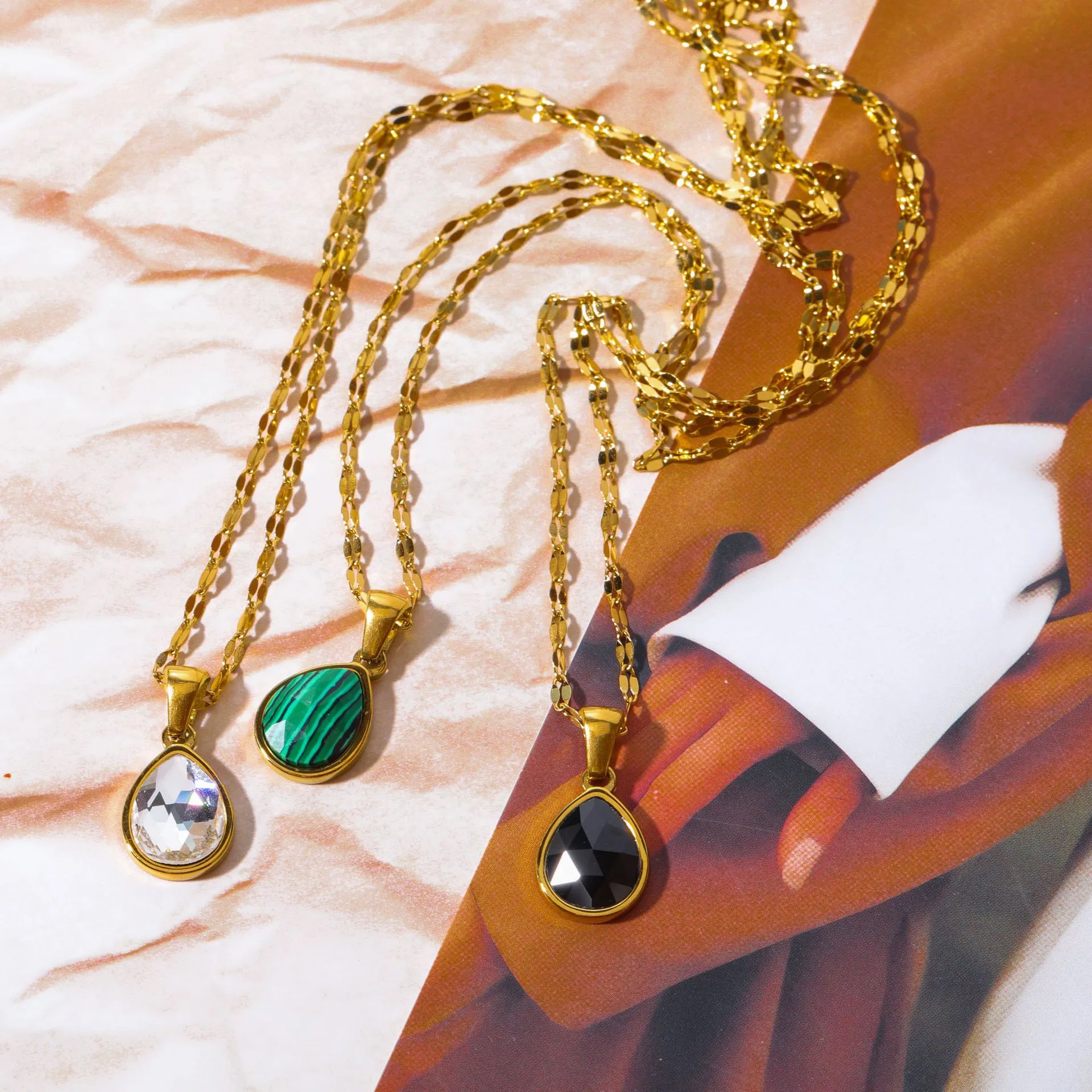 Features of the Cross-border Malachite Necklace Titanium Steel Water Drop Pendant Zircon Natural Stone Clavicle Chain Gold Plated Color Ornament