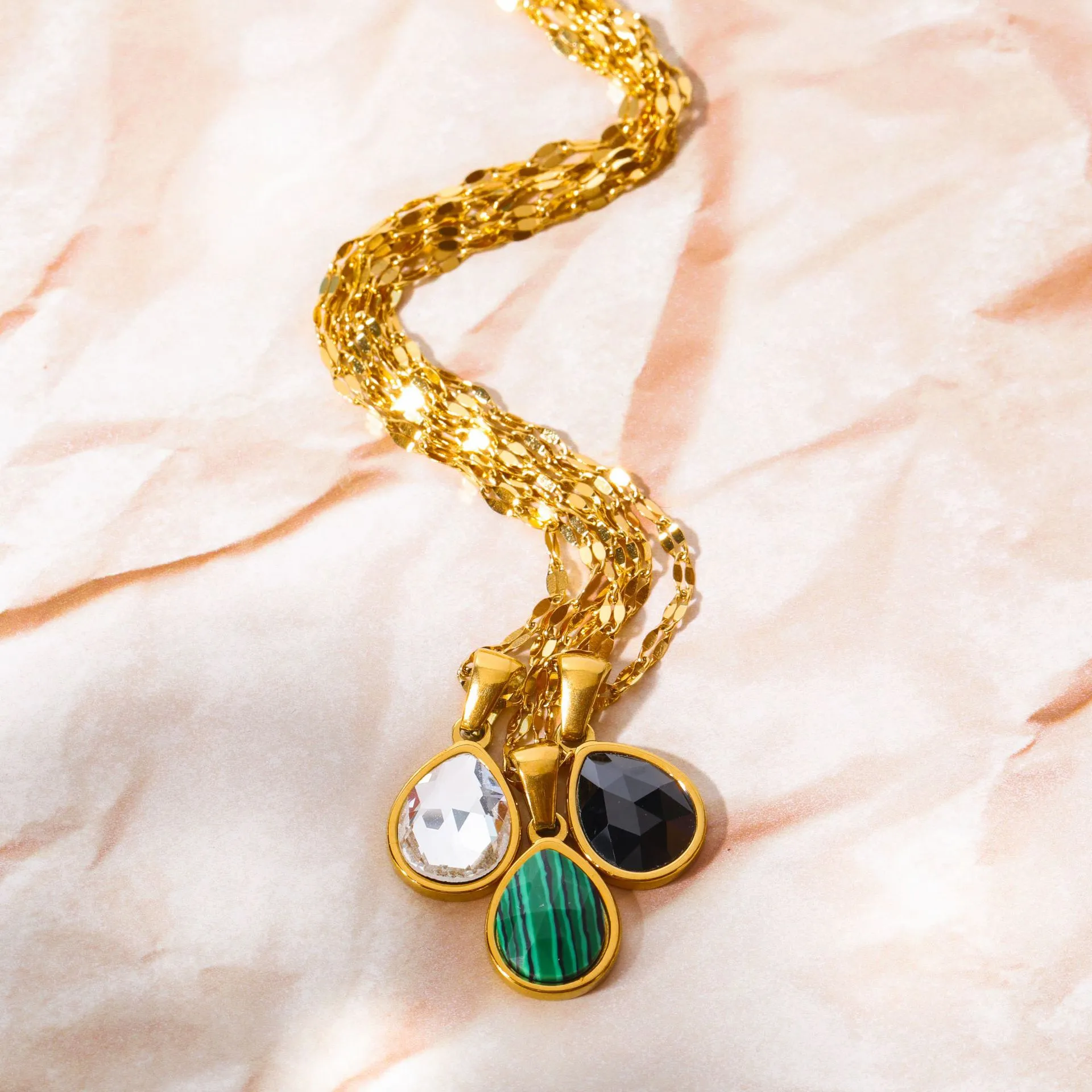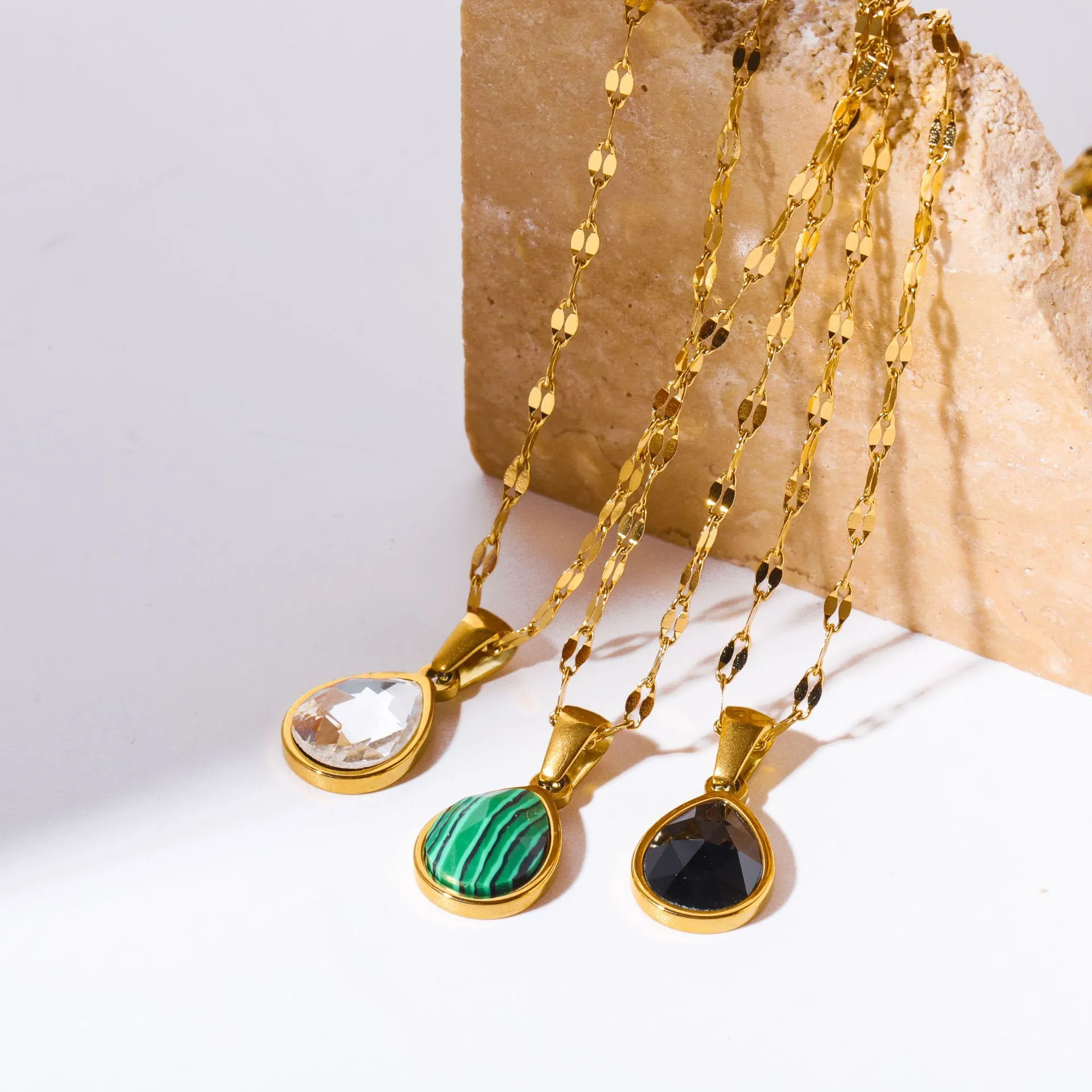 Why Choose the Cross-border Malachite Necklace Titanium Steel Water Drop Pendant Zircon Natural Stone Clavicle Chain Gold Plated Color Ornament?