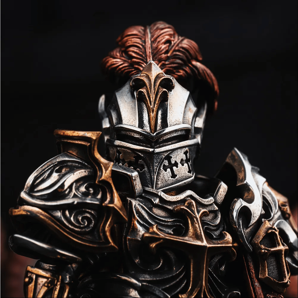 The figurine draws from classic medieval crusader imagery, featuring armour-inspired contours and a commanding stance that symbolises
