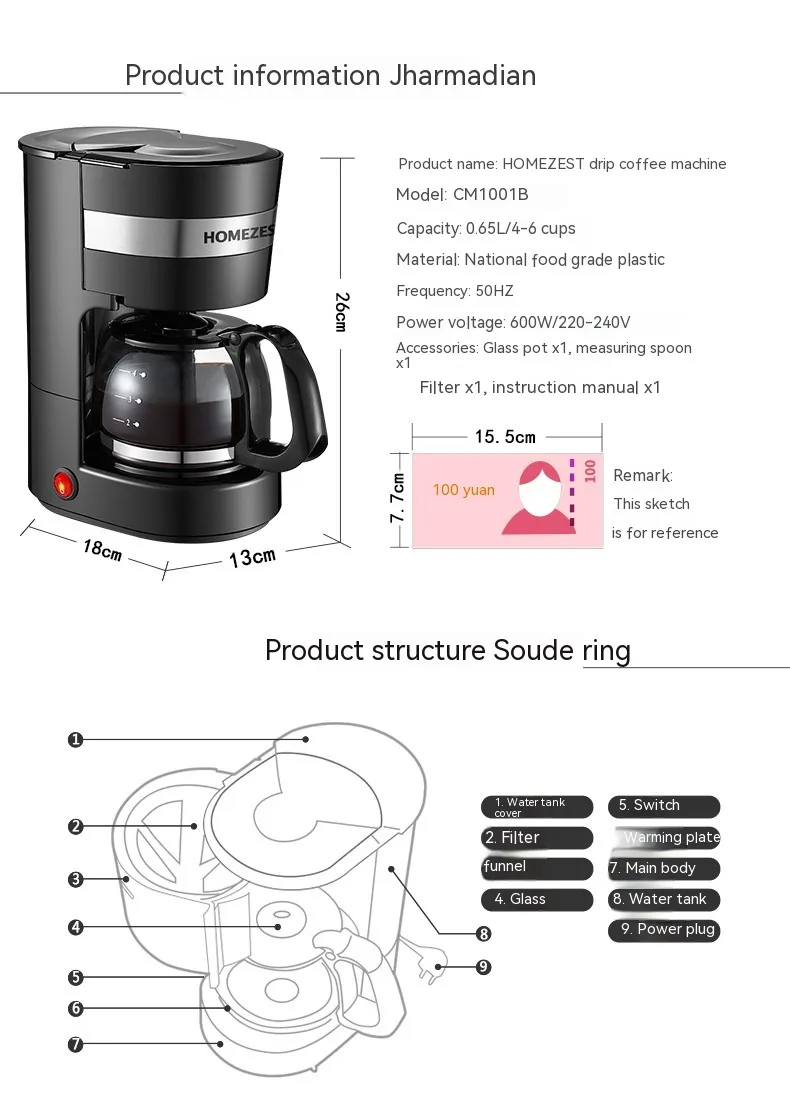 Accessories: glass pot x1, measuring spoon x1, filter x1, instruction manual x1