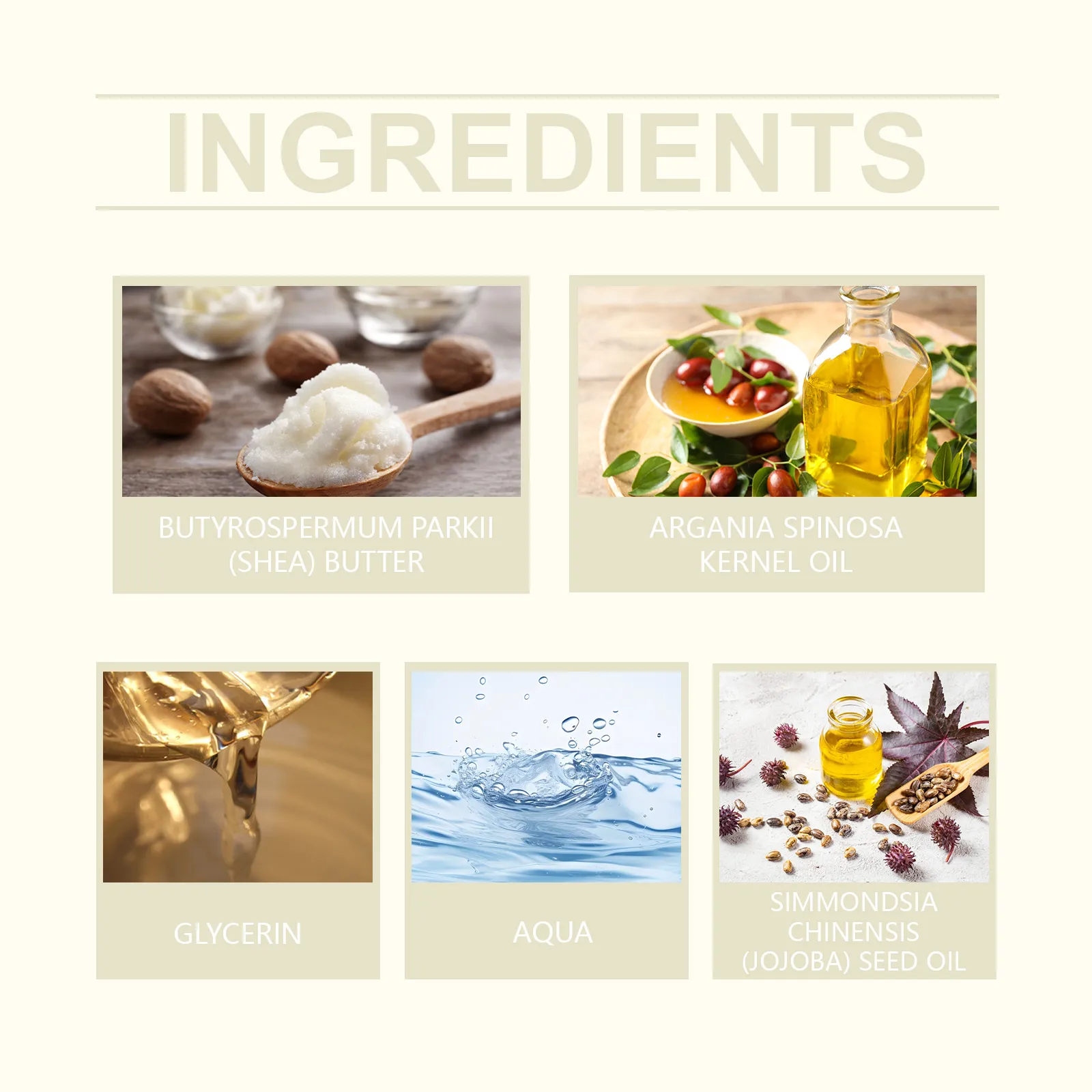 Product Ingredients: Water, shea butter, argan oil, glycerin, jojoba seed oil