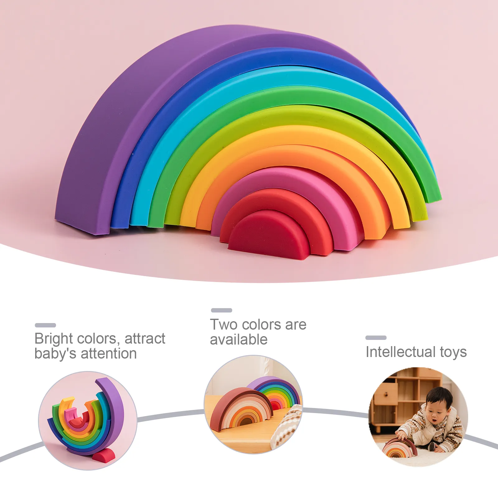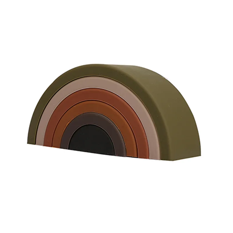 The building blocks feature a stunning rainbow arch design that includes multiple pieces in varying sizes and colors. The arcs can be stacked, nested, or arranged to create countless configurations.