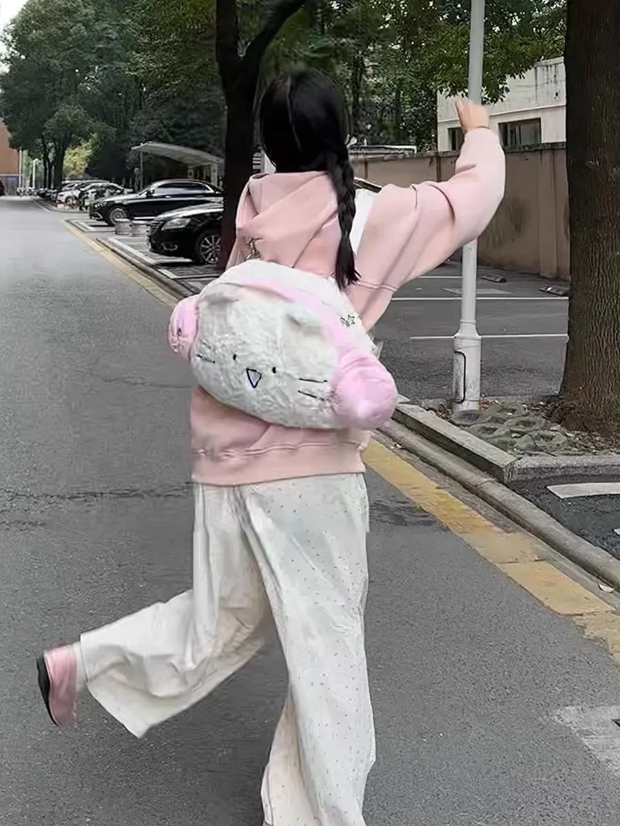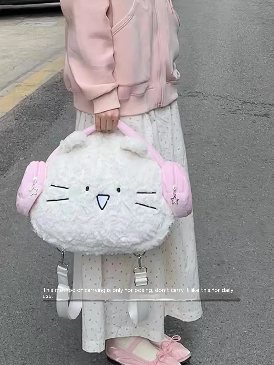 Step up your style with the Cute Earphone Cat Backpack, a charming plush bag designed to make a statement. Featuring an