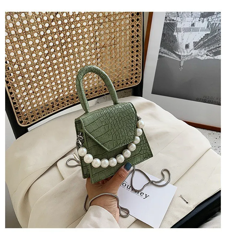 Elegant Pearl Detailing: The mini pouch is adorned with glistening pearl accents that