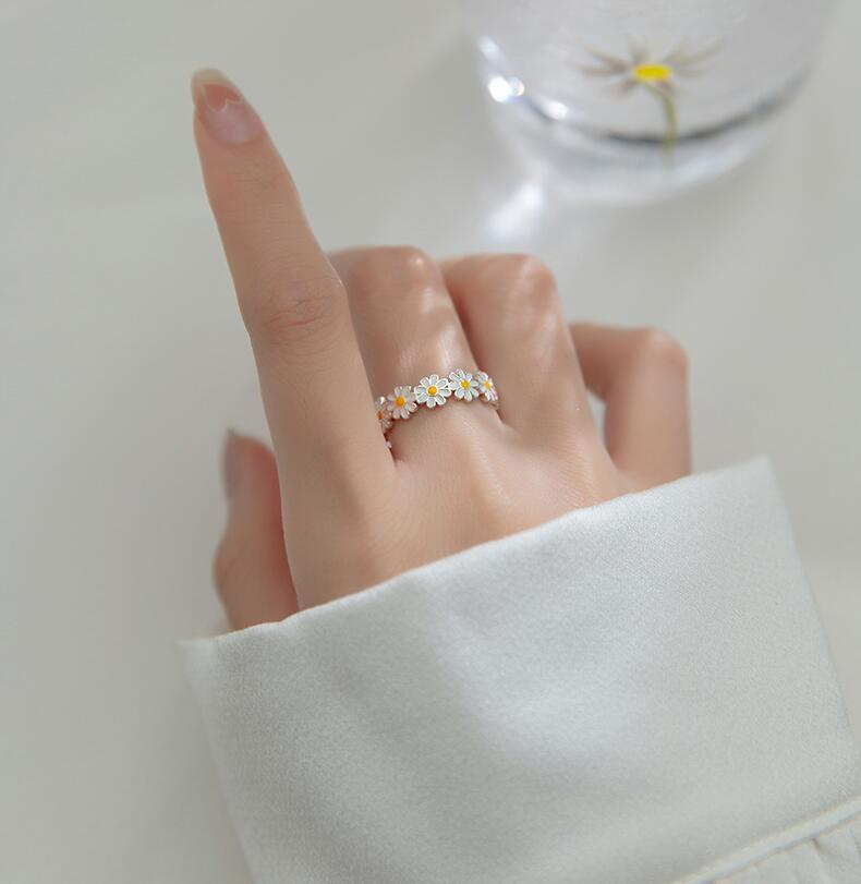 The ring is made from high-quality sterling silver, providing a durable and lustrous base for the intricate design. Each daisy is accented