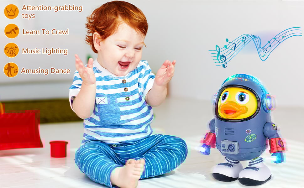 👶 Dancing Space Duck: This baby musical toy is designed in the shape of a yellow duck wearing a space suit. It can