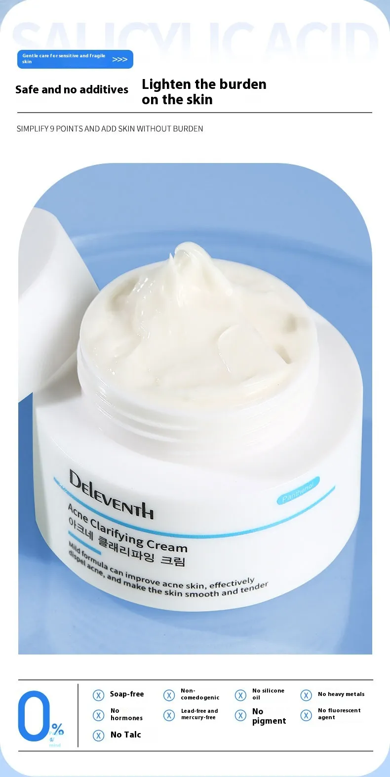 DeLeventh Acne Clarifying Cream is not just another acne treatment—it's an all-in-one solution for oily and acne-prone skin. With scientifically-backed ingredients like salicylic acid, it fights acne on all fronts, including reducing oil production, preventing clogged pores, and rejuvenating your skin. Plus, the added panthenol keeps your skin smooth and moisturized, preventing the dryness and irritation often associated with acne treatments.