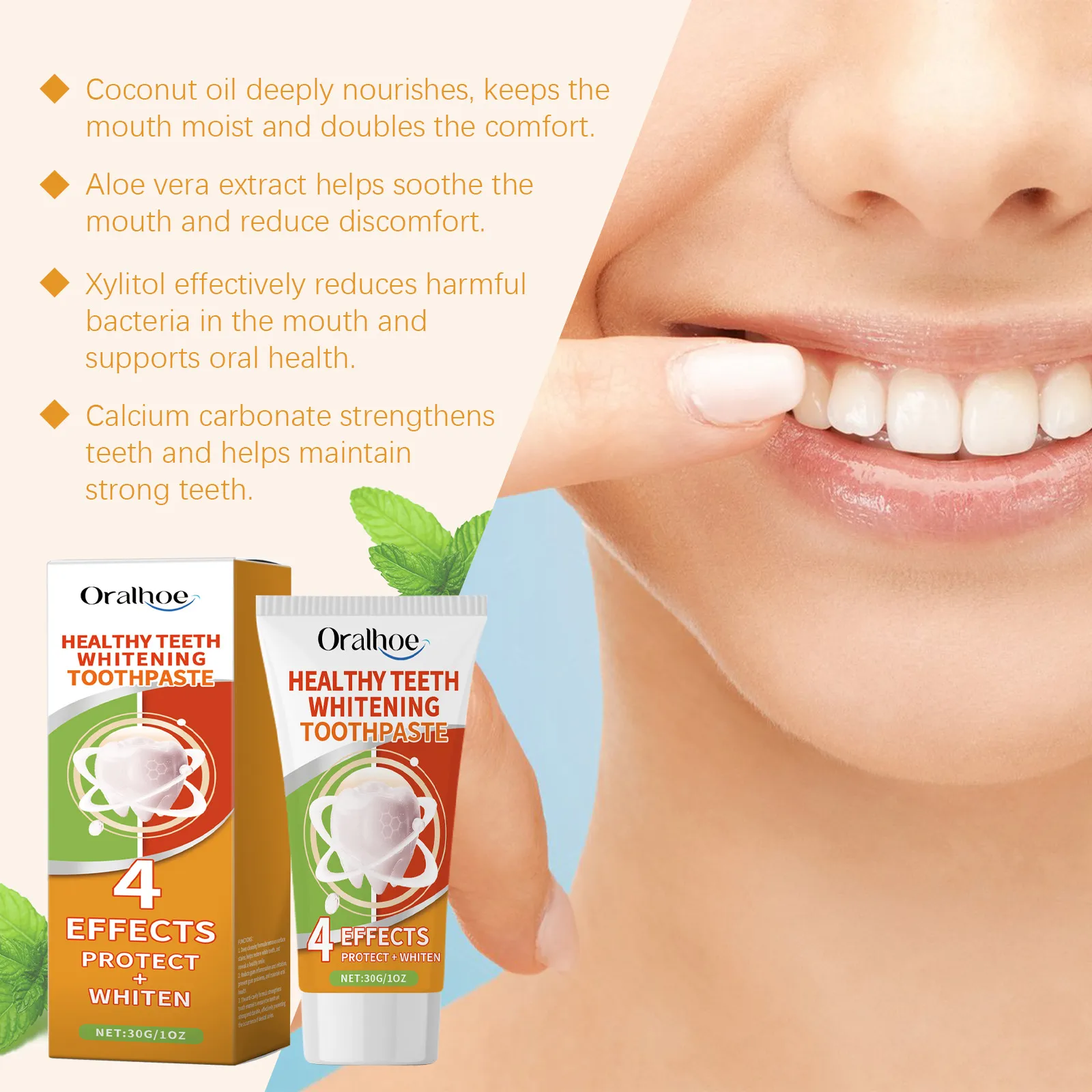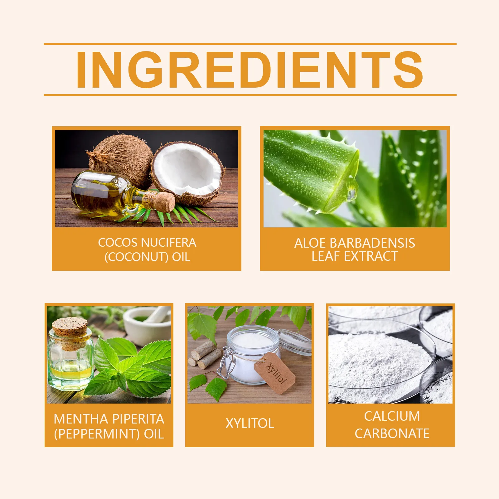 Product Ingredients: Coconut Oil, Aloe Vera Extract, Peppermint Leaf Oil, Xylitol, Calcium Carbonate