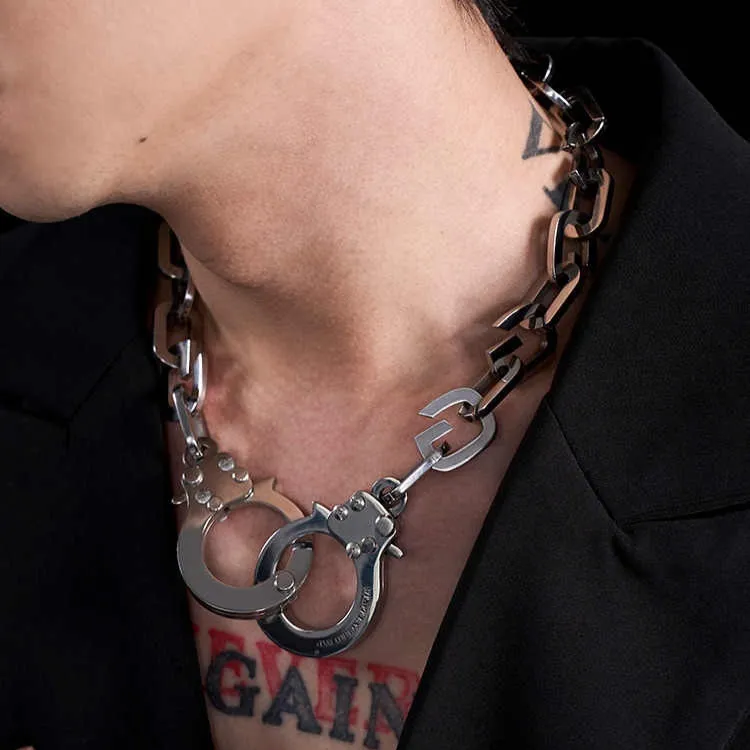 Pair the Heavy Industry Titanium Steel Handcuffs Necklace with a leather jacket, black jeans, and combat boots for an edgy street style look. The necklace adds a rebellious element that elevates the overall outfit.