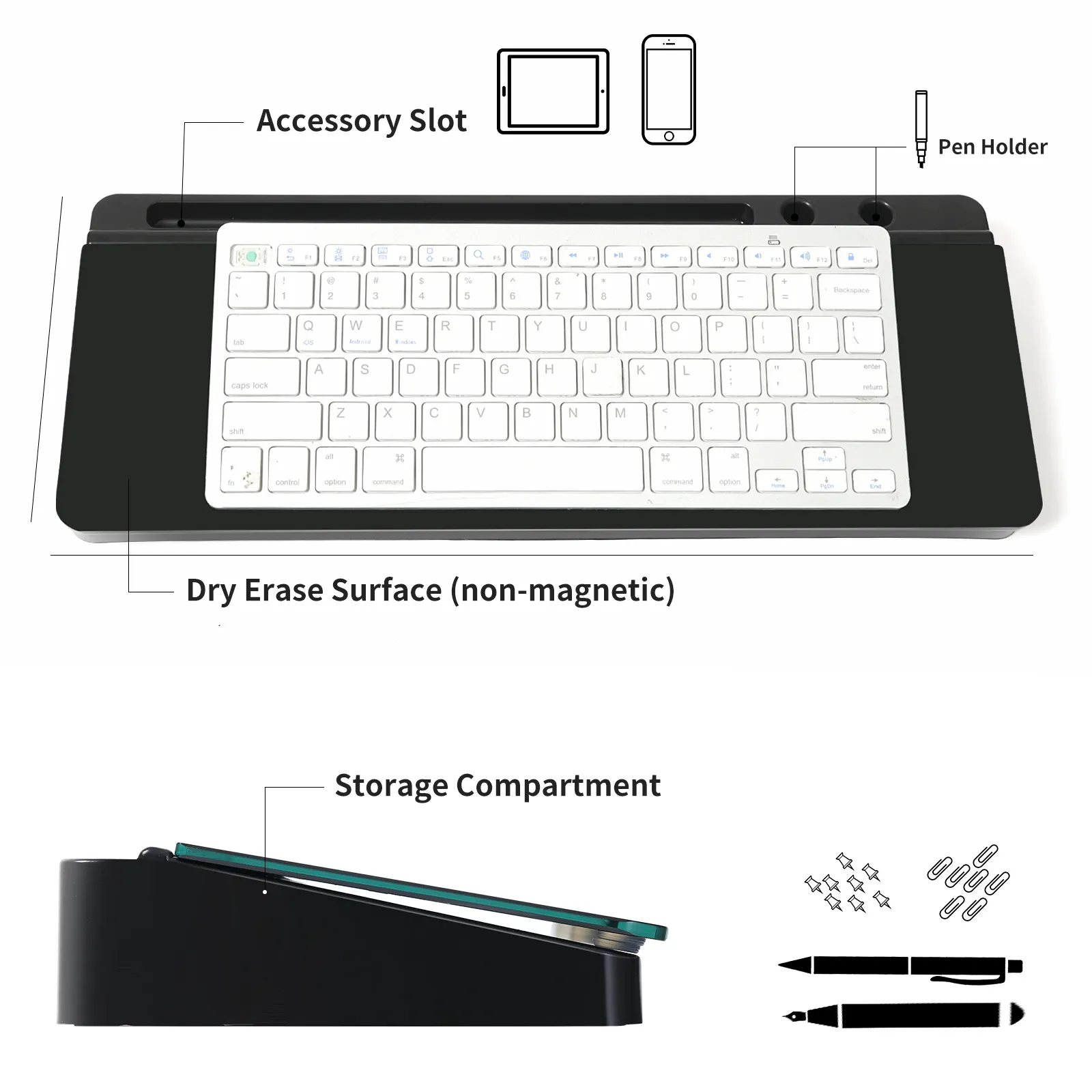 Designed for maximum convenience, this desktop whiteboard also includes built-in storage to keep your workspace tidy. You can store pens, markers, erasers, and other essentials in the discreet storage compartment located underneath the board. The board’s compact size fits perfectly on your desk, allowing for easy access to quick notes while minimizing clutter.