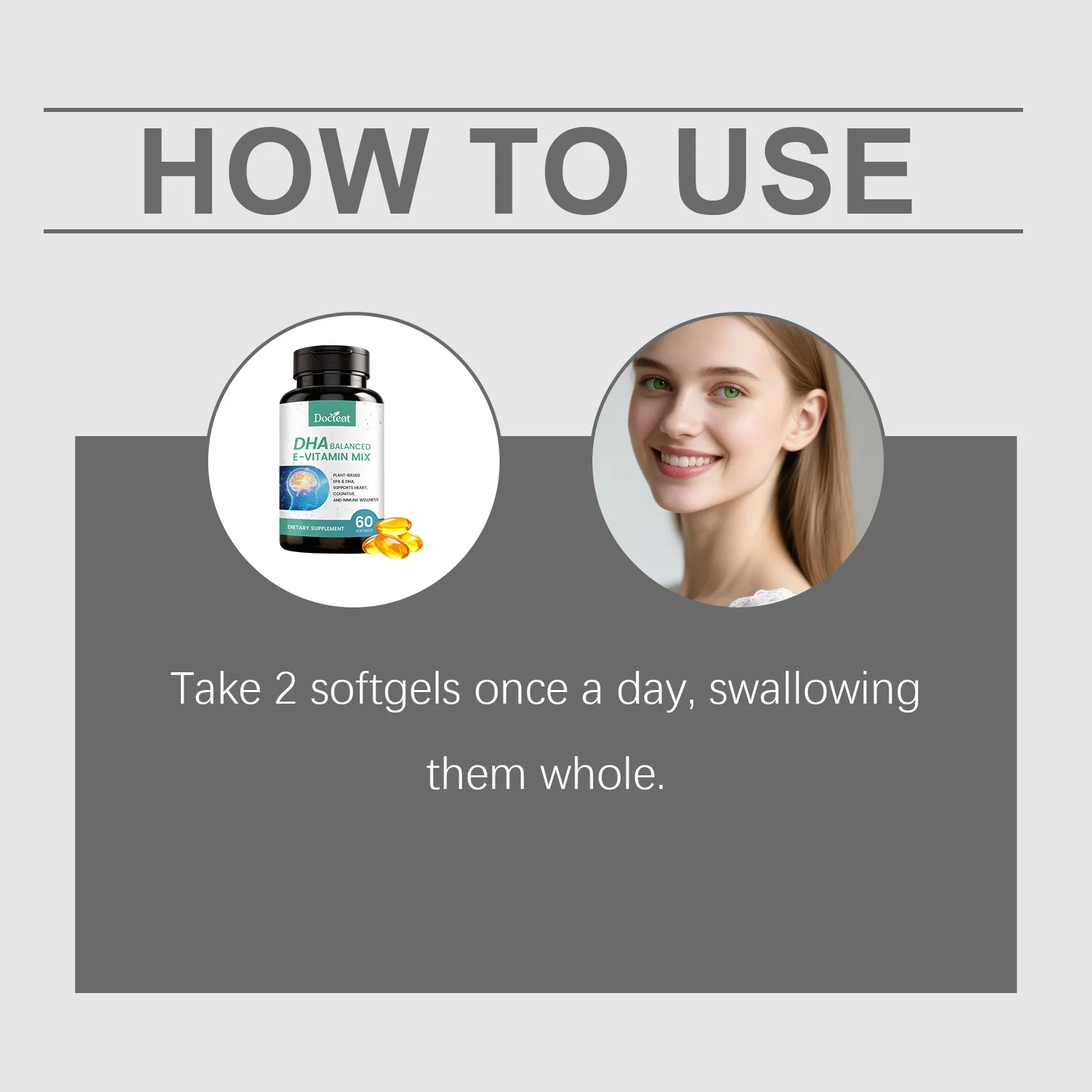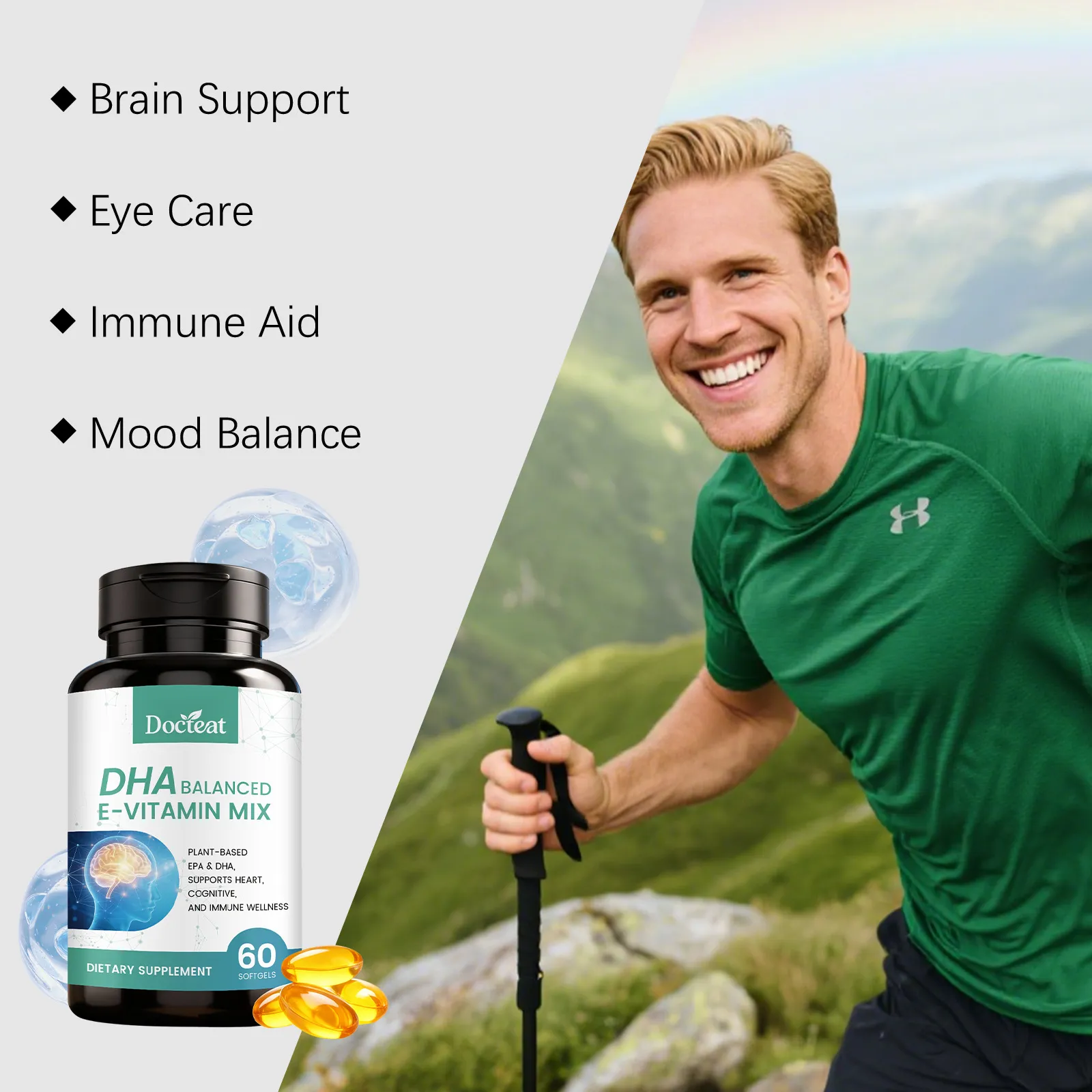 DHA vitamin E supplement, plant based DHA EPA, omega DHA capsules, vitamin E softgels, brain health supplement, heart health omega supplement, immune support supplement, fish free omega supplement, dietary supplement softgels, DHA EPA capsules