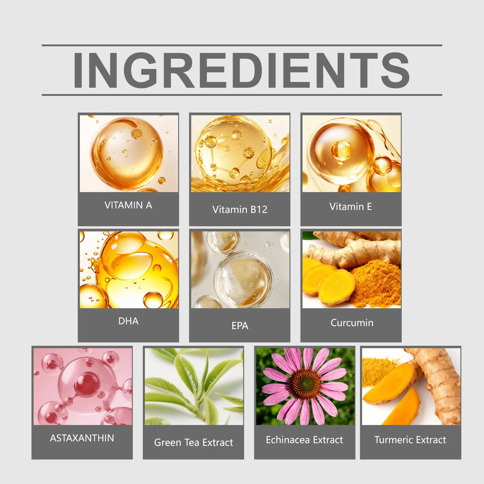 Ingredients: vitamin A, vitamin B12, vitamin E, DHA, EPA, curcumin, astaxanthin, green tea extract, Echinacea purpurea extract, turmeric