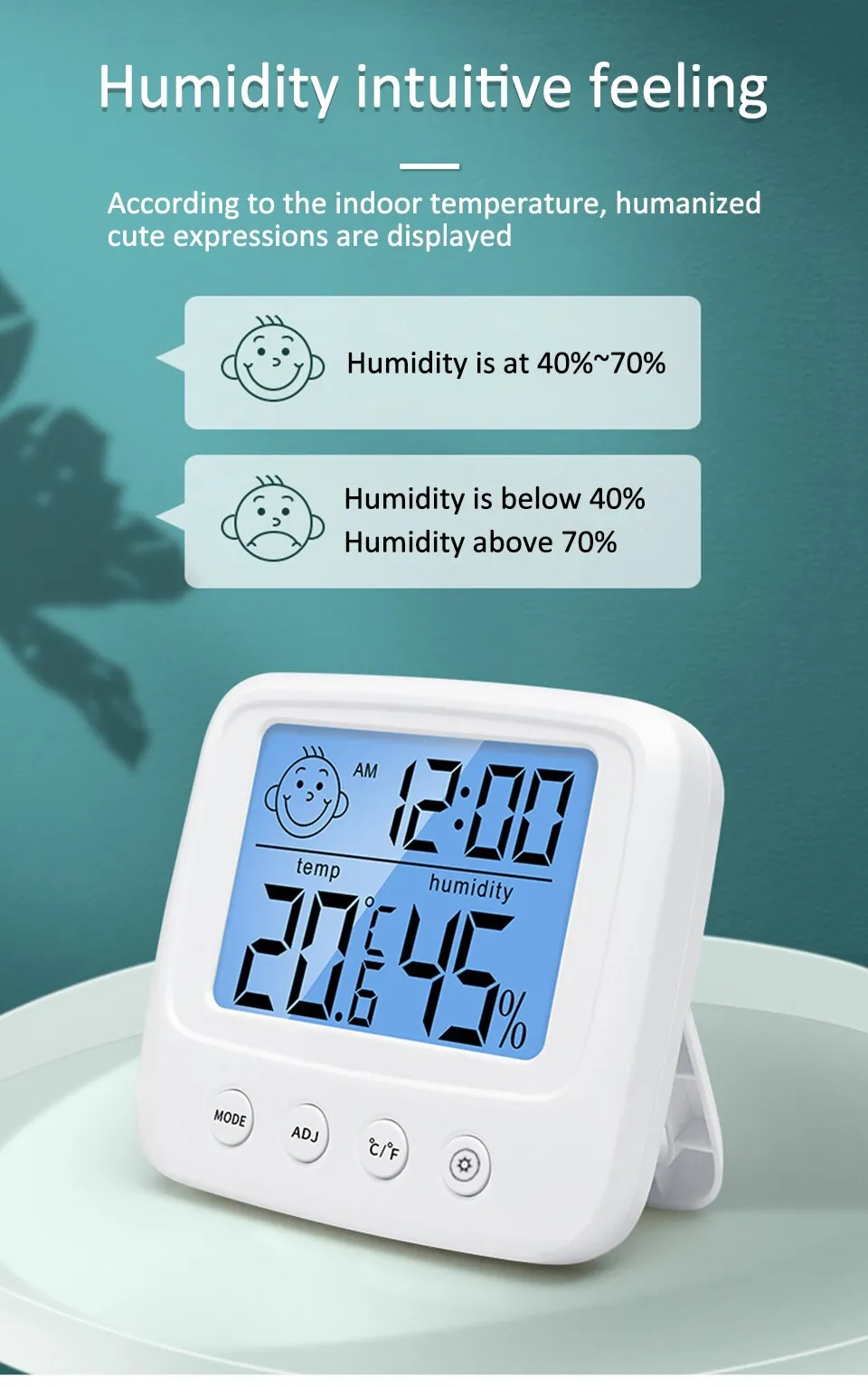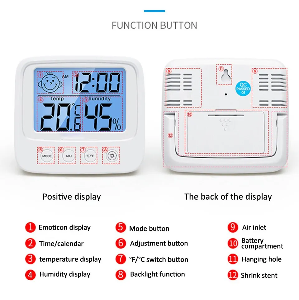 3. Large LCD display, this humidity thermometer adopts LCD display and clear large digital indicator, which can display indoor temperature