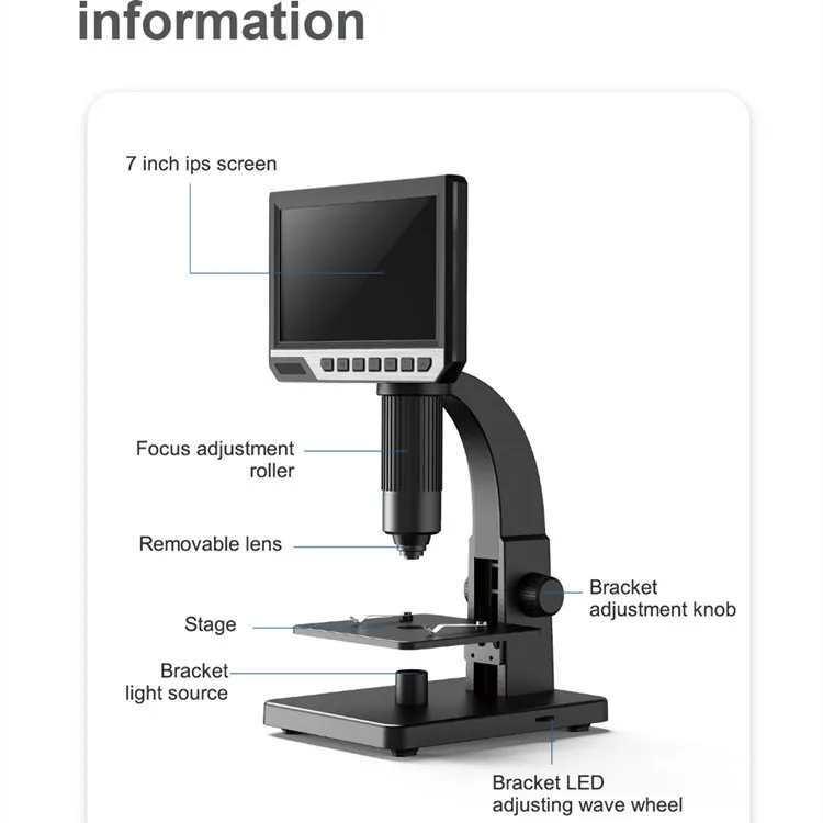 With its advanced technology and user-friendly design, the Digital Microscope HD 7 Inch combines functionality with convenience. The high-resolution display and adjustable magnification features ensure you can view your subjects in incredible detail, while the built-in camera allows you to capture still images and record videos of your observations.